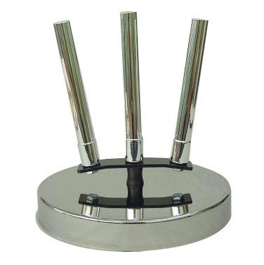 - 1 base circolare per asta porta bandiera a 3 posti in ferro cromato. Diametro cm 28 composta da una zavorra in cemento rivestita in plastica e un coperchio in ferro con finitura cromata. Sulla parte superiore sono fissati tramite vite sottostante i canotti di cm 20 dove inserire le aste di diametro mm 22; i 3 canotti dove inserire le aste sono installati nei 3 fori della piastra semicurva forata, montata su un distanziale in ferro verniciato.