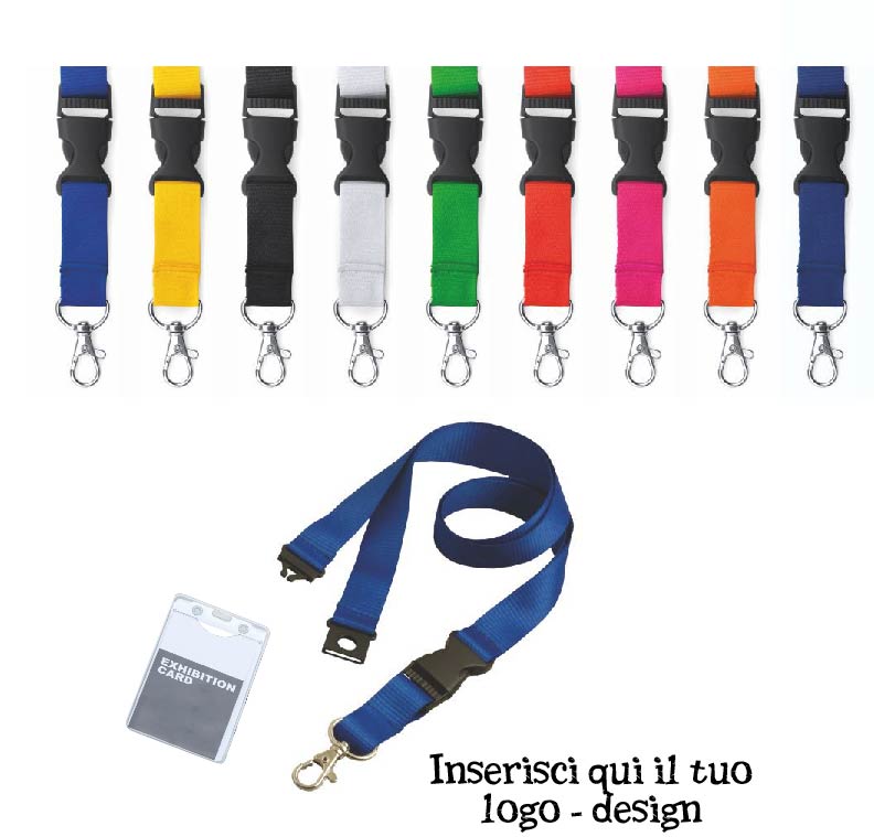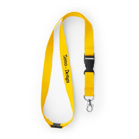 Lanyard in poliestere con moschettone in metallo, fibbia staccabile e sgancio di sicurezza.