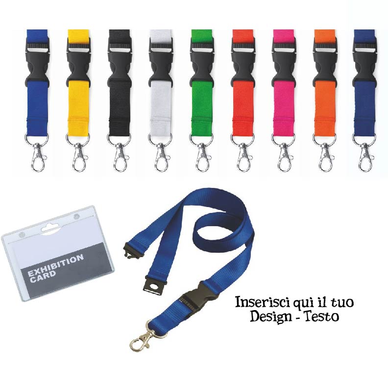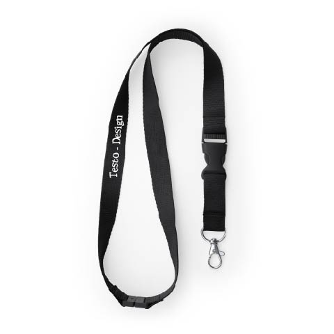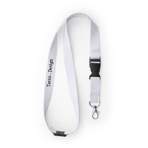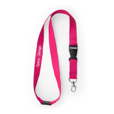 Lanyard in poliestere con moschettone in metallo, fibbia staccabile e sgancio di sicurezza.