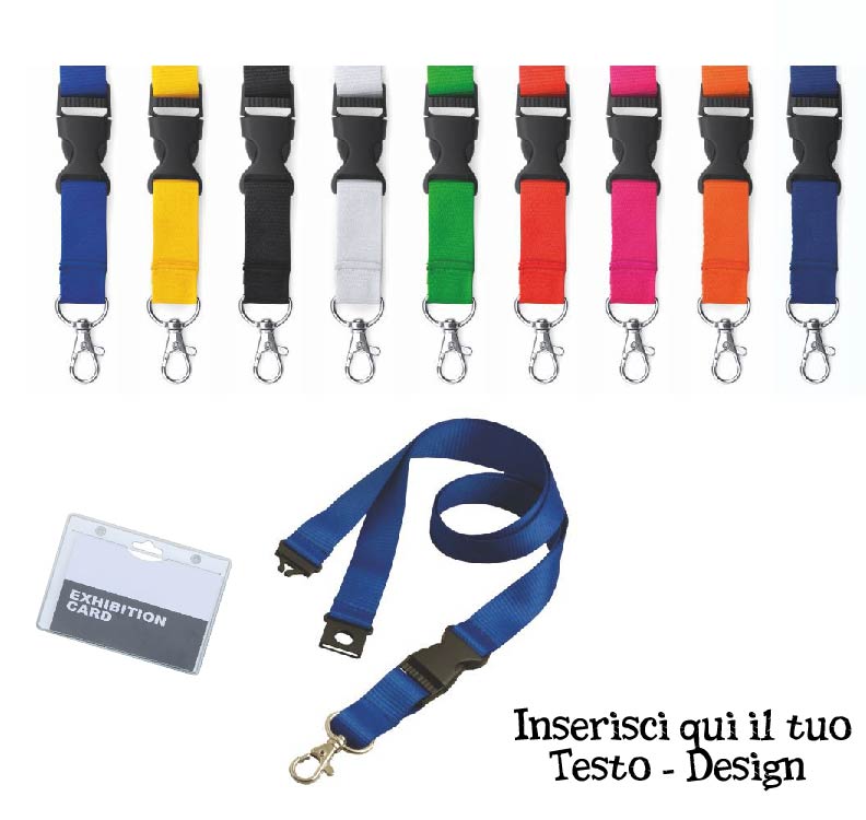 Lanyard in poliestere con moschettone in metallo, fibbia staccabile e sgancio di sicurezza.