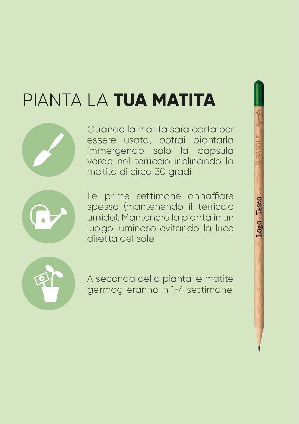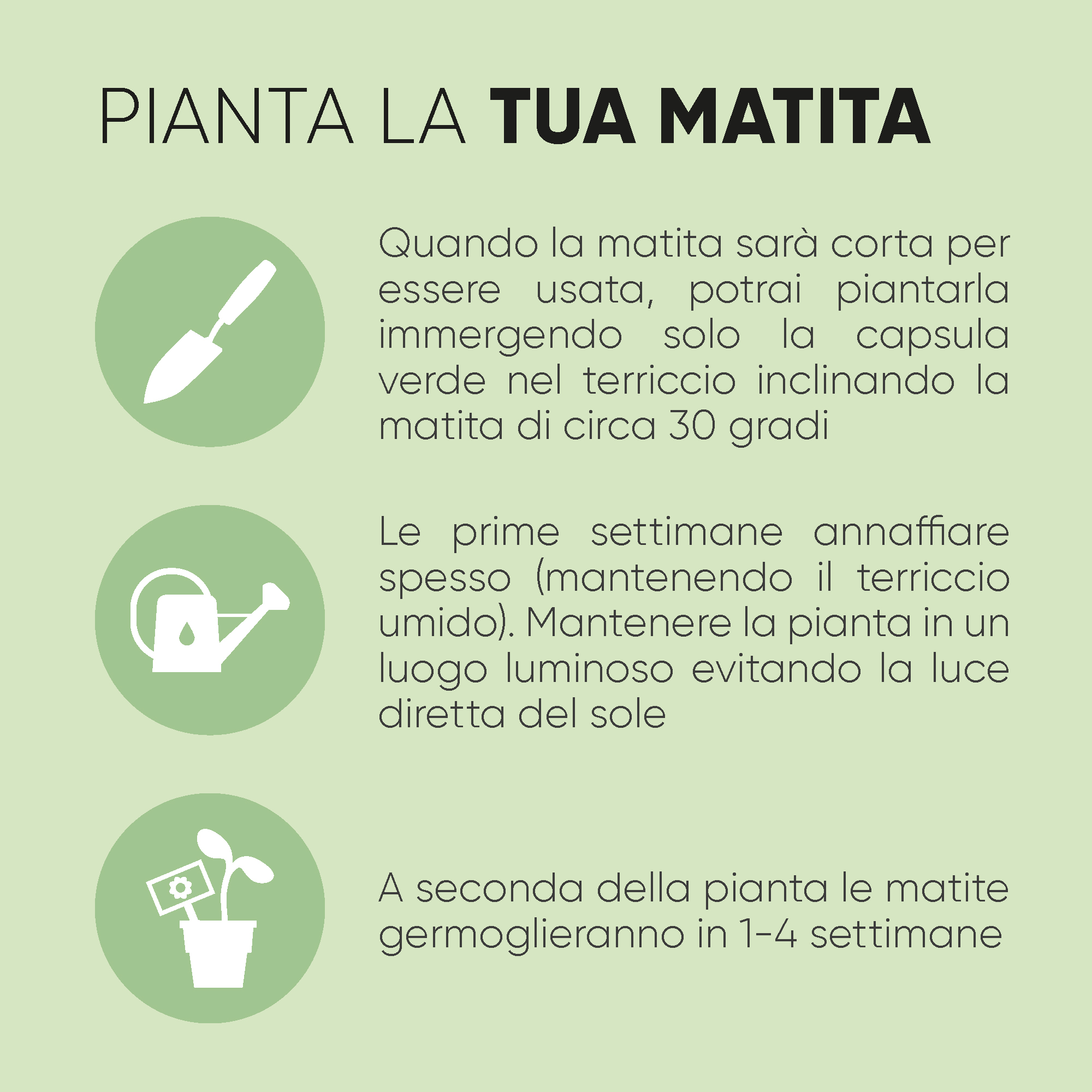 1) Immergere solo la capsula verde (biodegradabile) nel terriccio inclinando la matita di circa 30 gradi