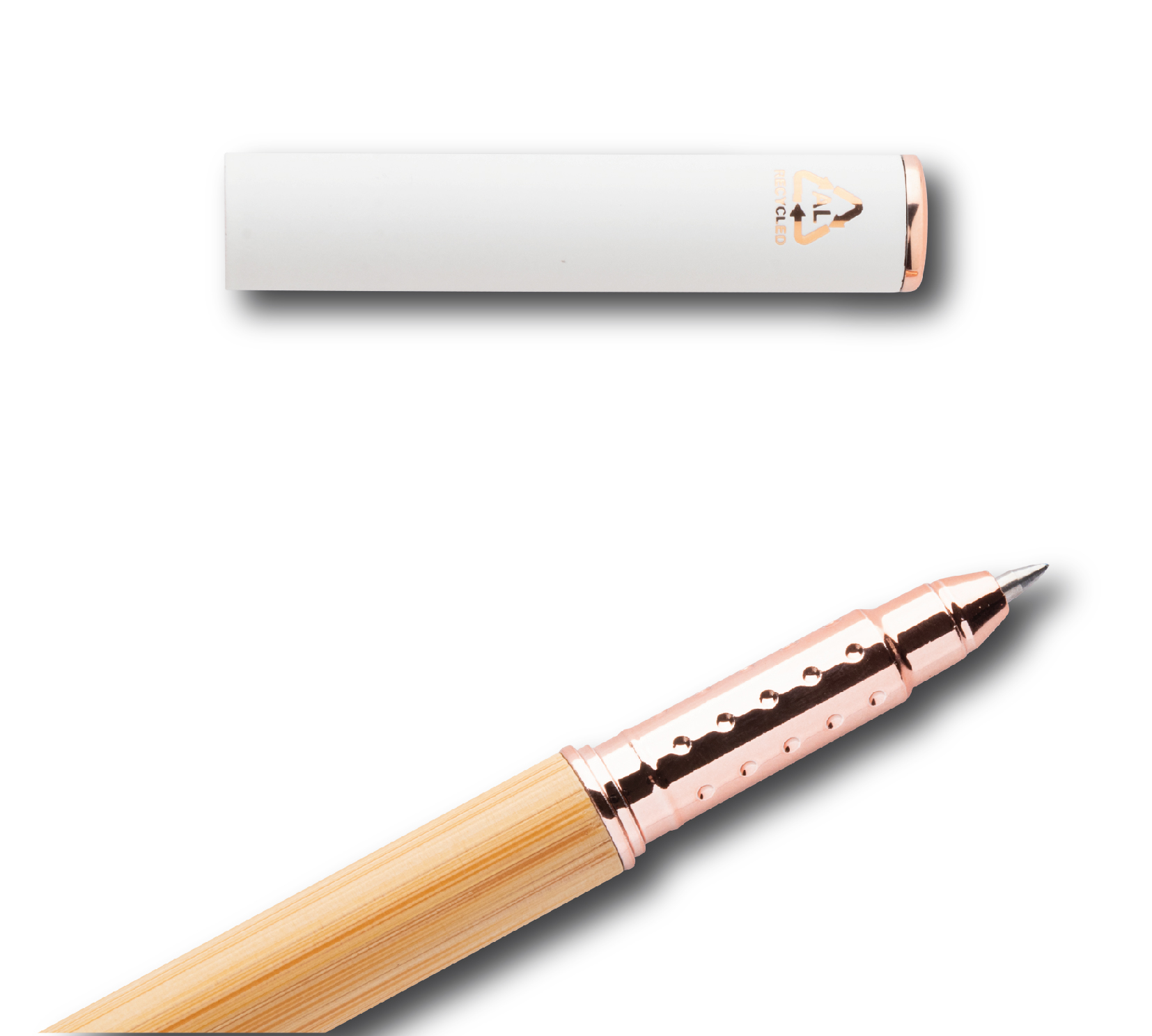 Penna roller in bambù e alluminio riciclato con cappuccio gommato e dettagli in oro rosa. Rivestimento speciale. Refill blu.