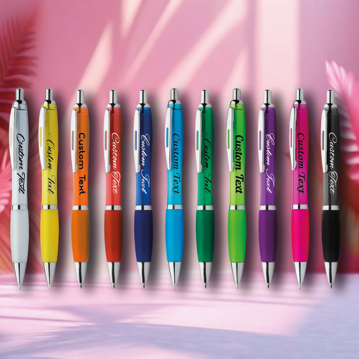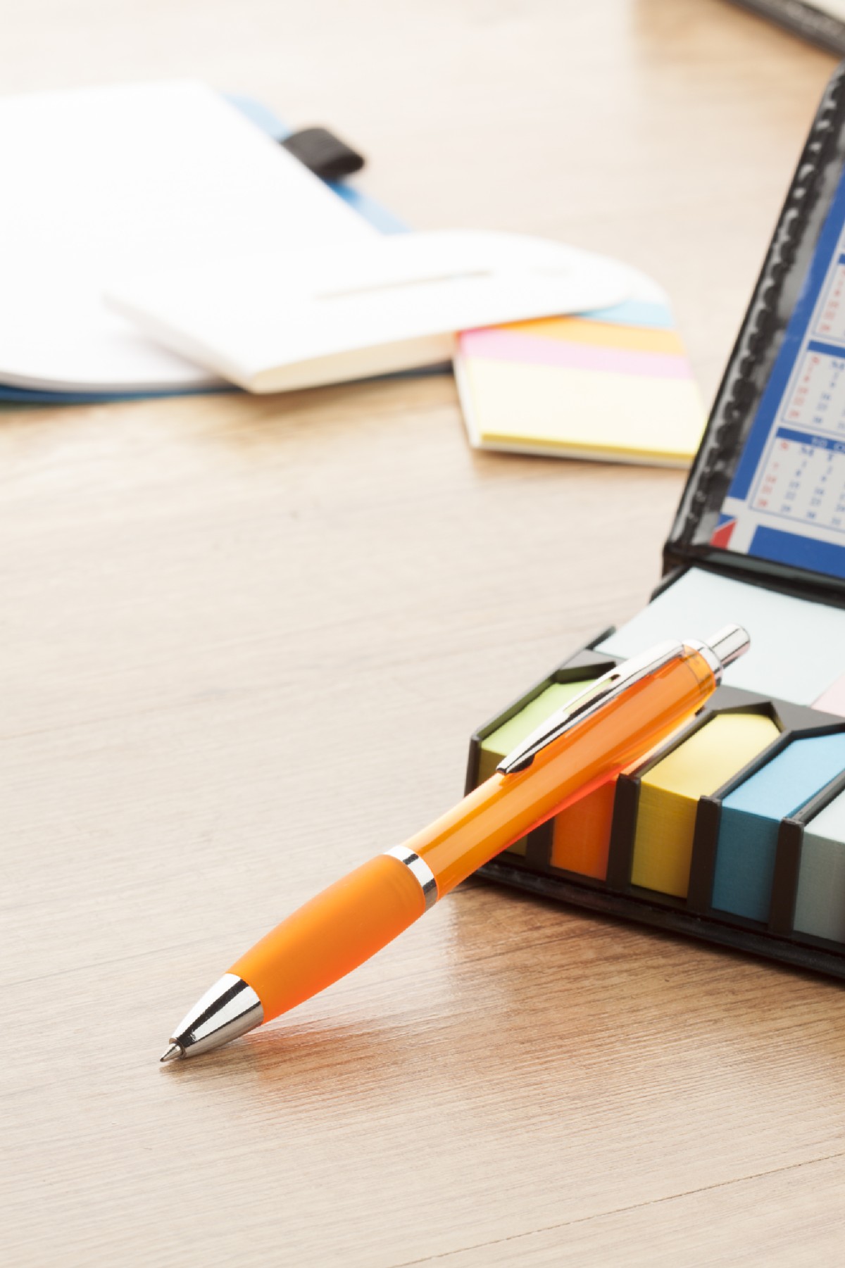 Penna a sfera in plastica con corpo trasparente, impugnatura coordinata e parti cromate lucide. Con refill blu.