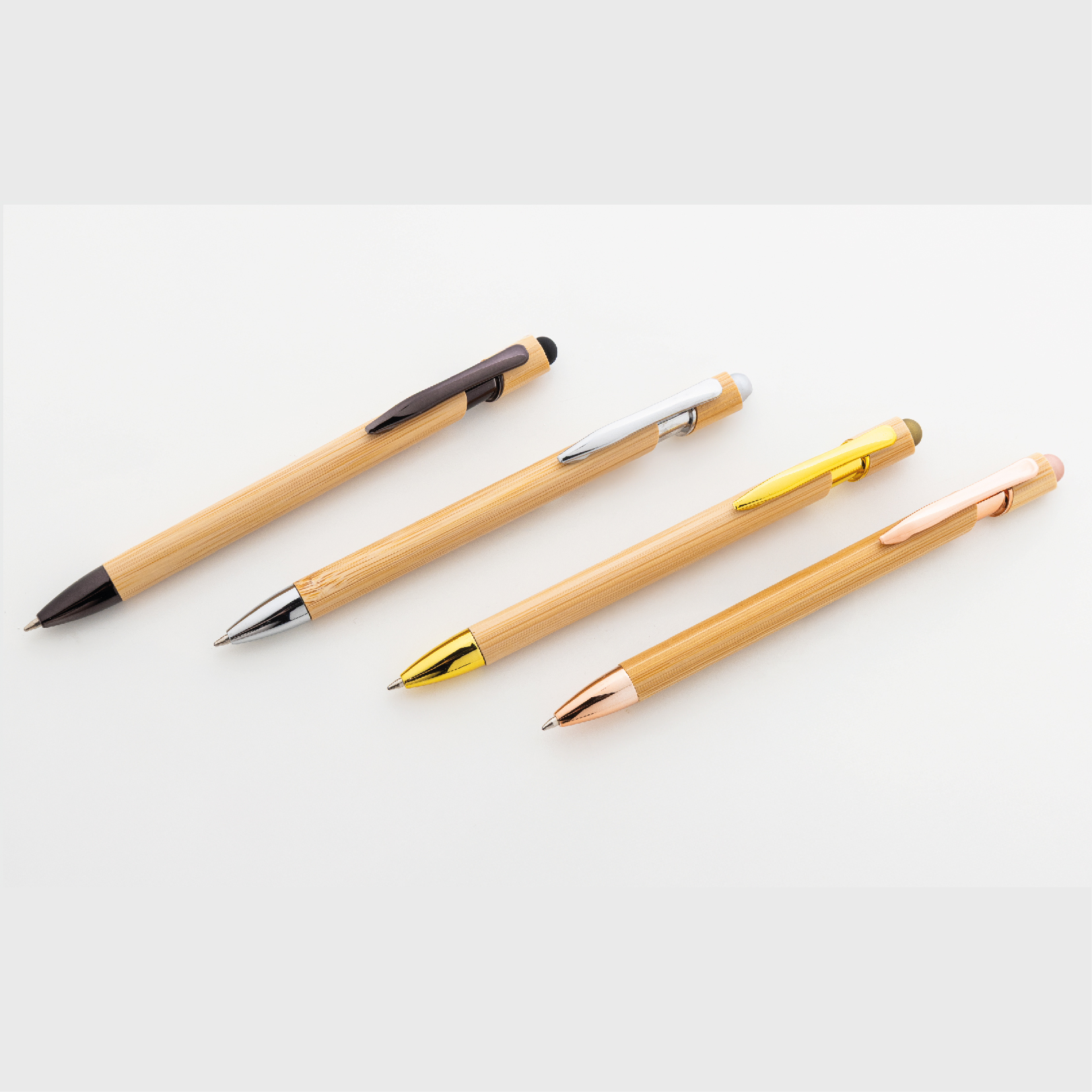 Penna a sfera in bambù con refill blu, dettagli metallici lucidi e pennino capacitivo in colore coordinato.