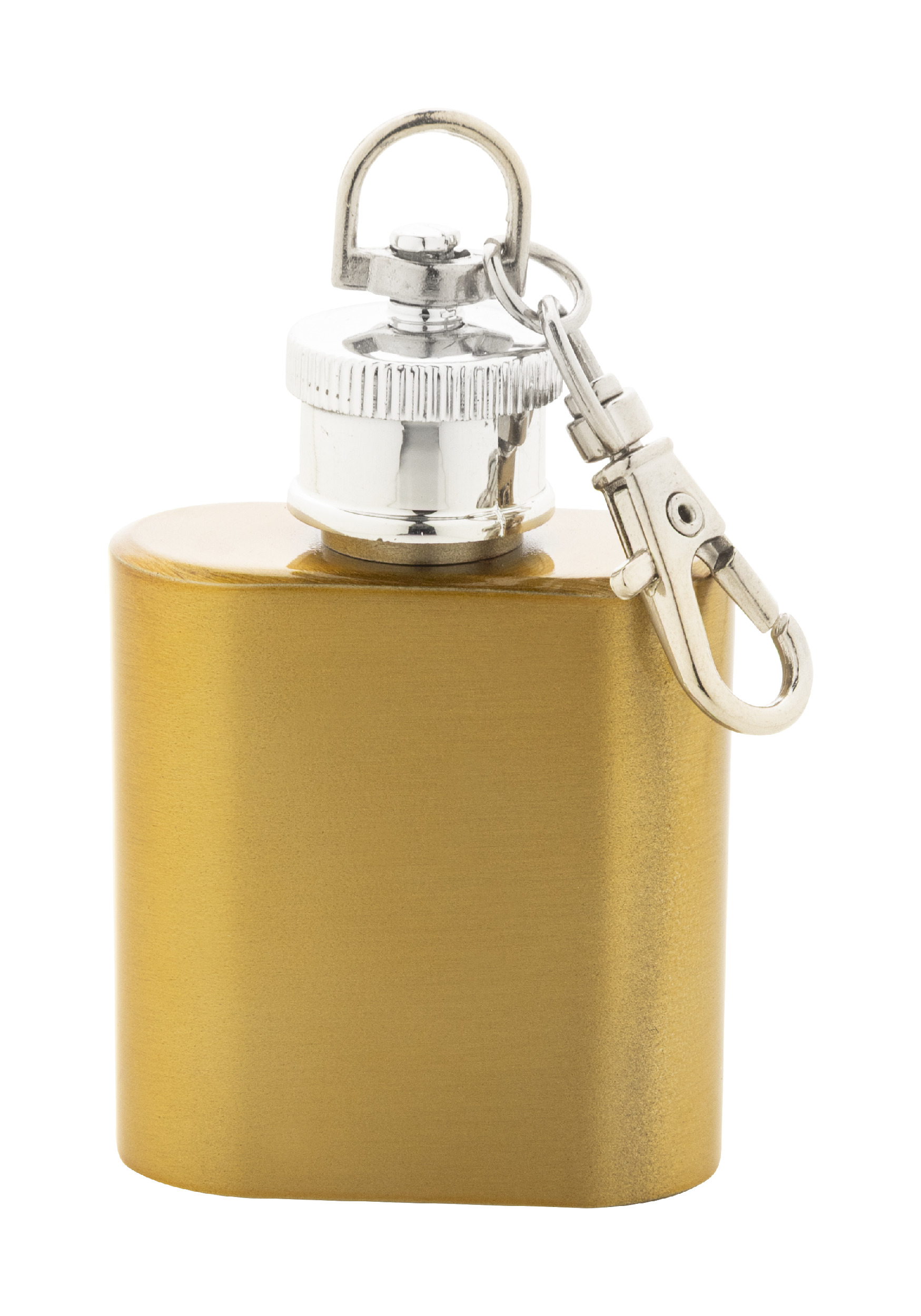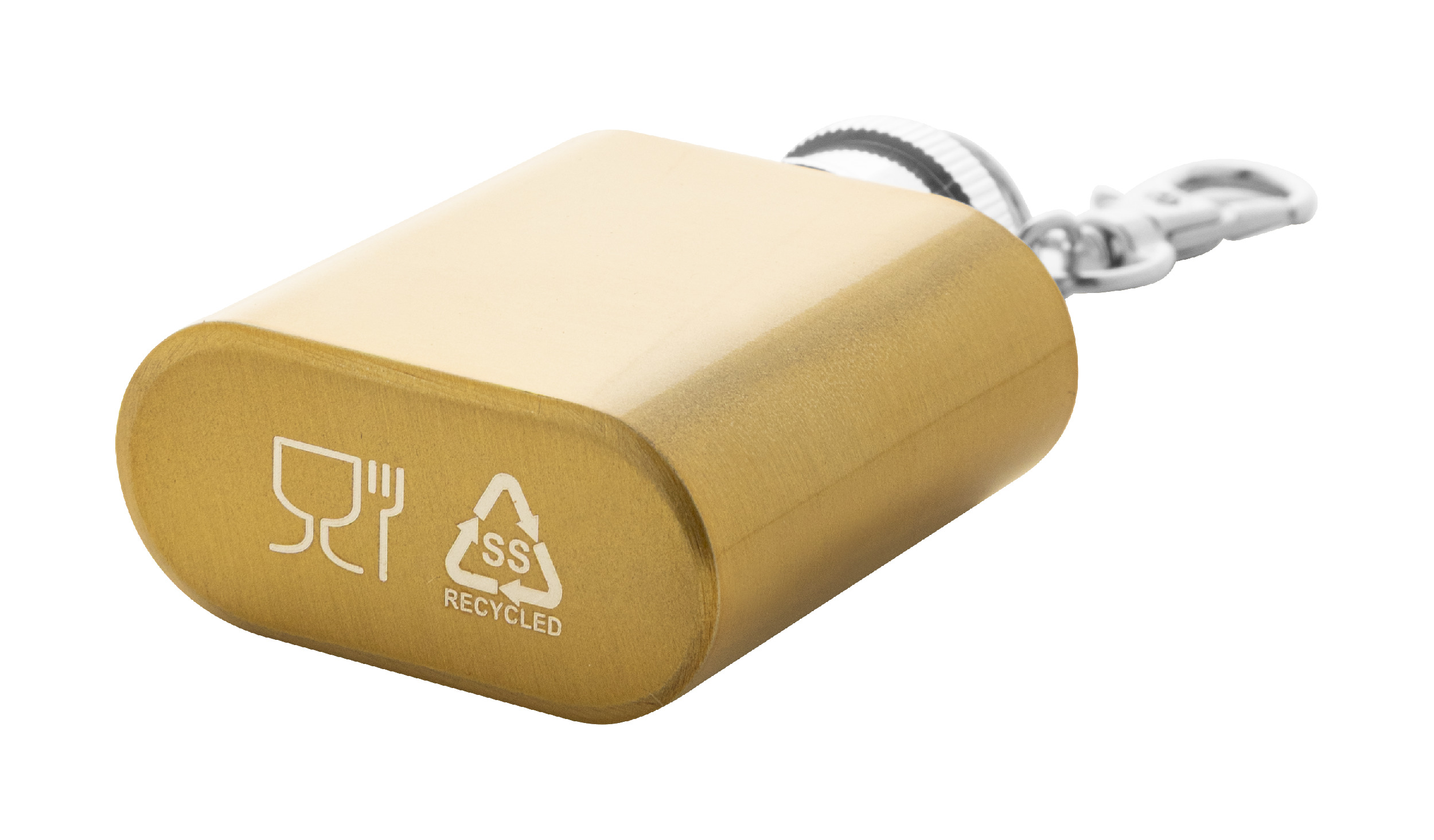 Mini fiaschetta in acciaio riciclato da 30ml con finitura metallica lucida e portachiavi con moschettone.