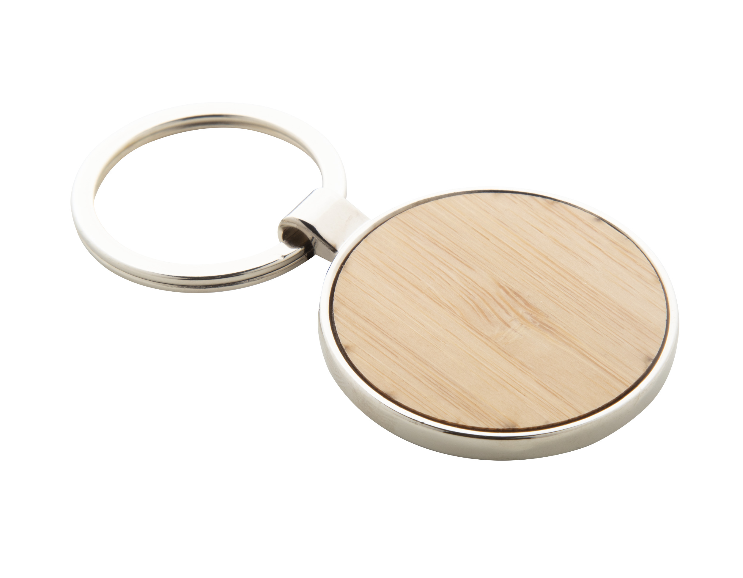 Portachiavi in metallo di forma rotonda con inserto in bambù. In confezione di carta kraft.