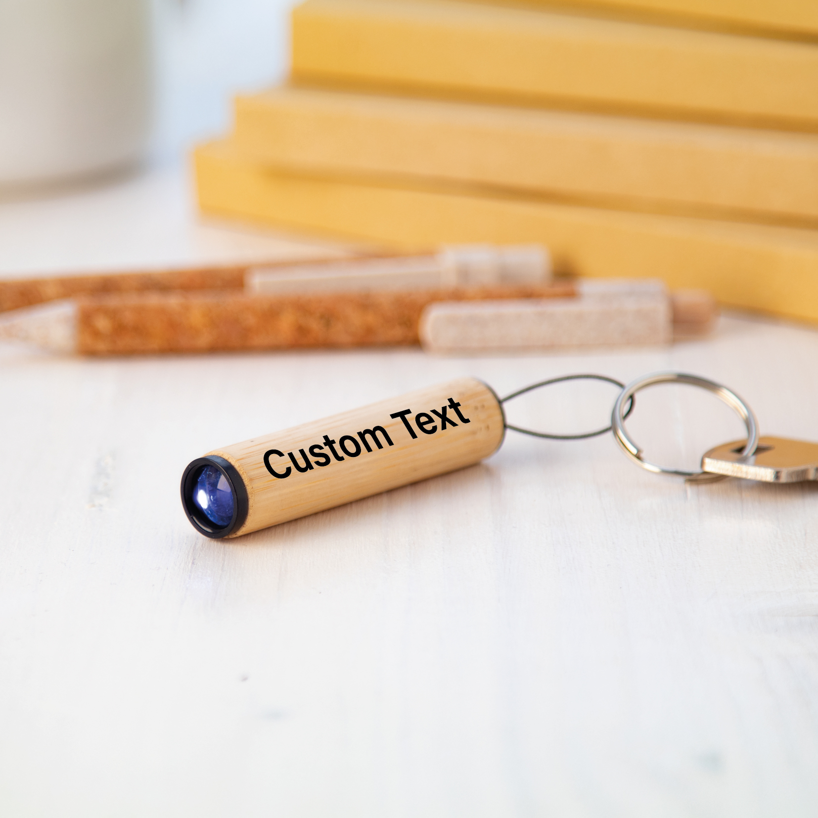 Mini torcia in bambù con 1 LED e portachiavi in metallo. Completa di batteria a bottone.