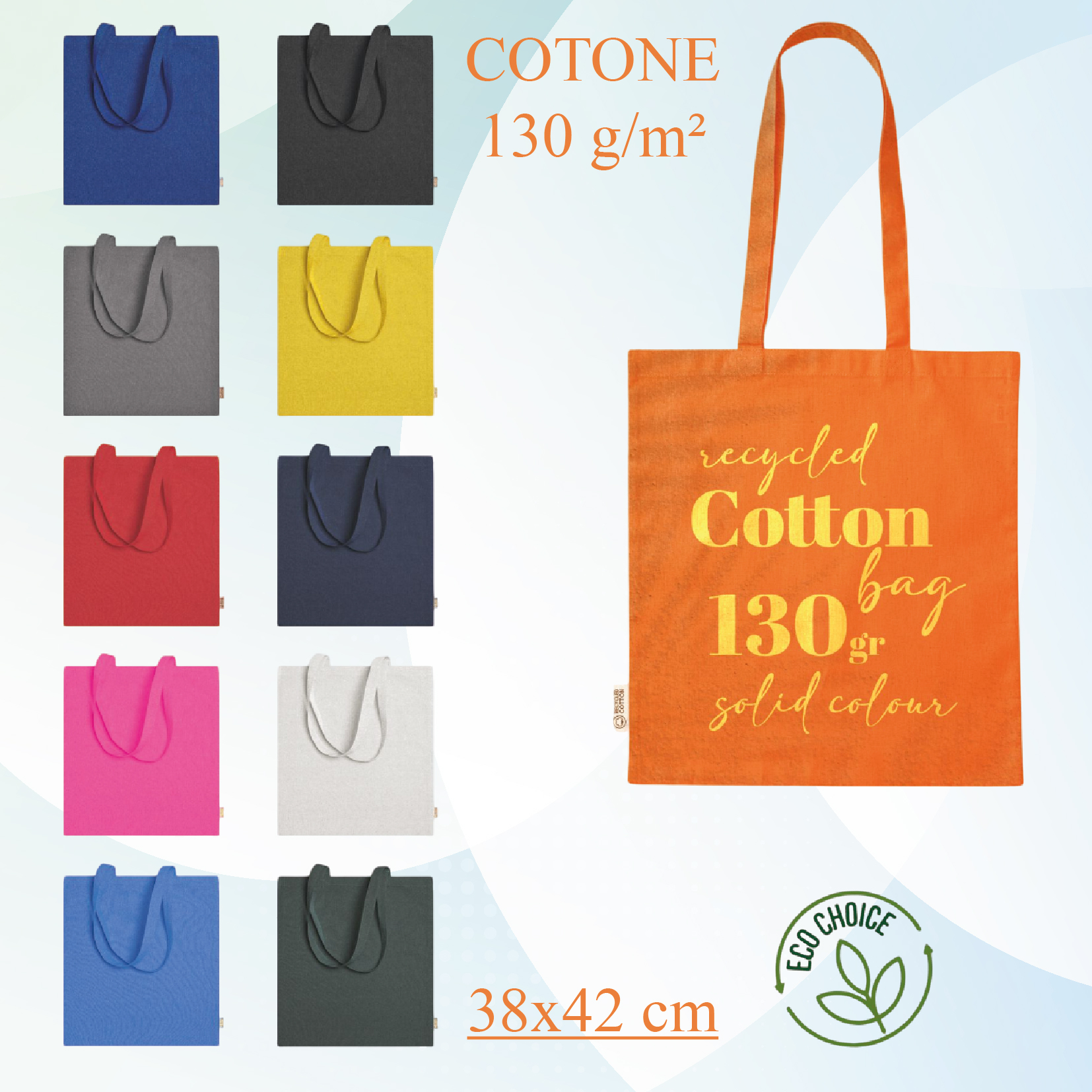 Borsa shopping in cotone riciclato 130 g/m² con manici lunghi cm 70. Dimensioni: cm 38x42 .