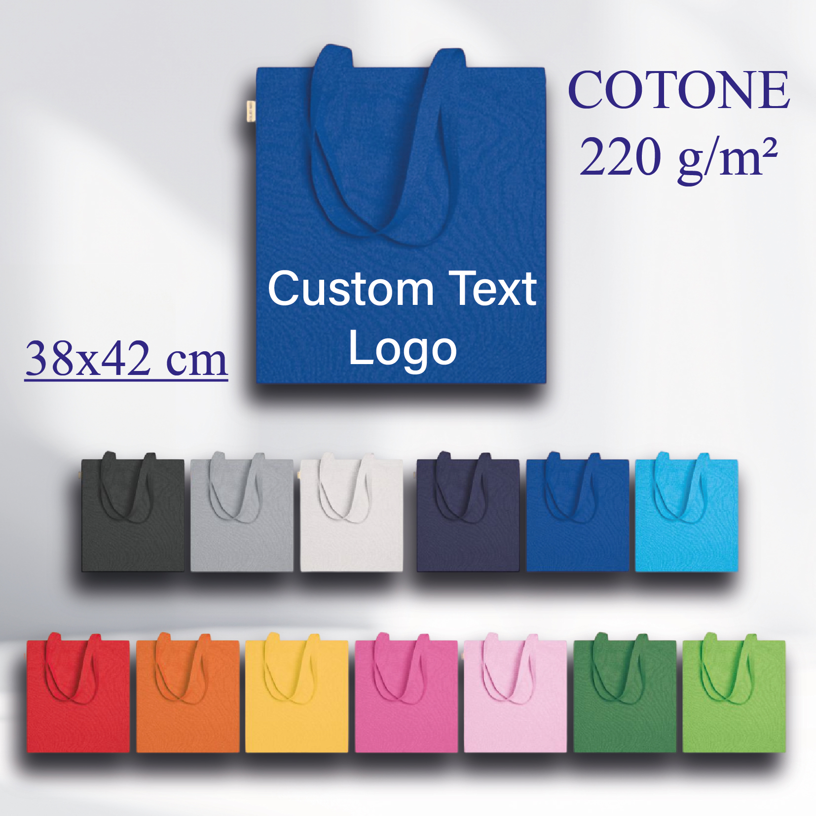 Borsa in cotone da 220 grammi, lunghezza manico 70x2,5 cm.