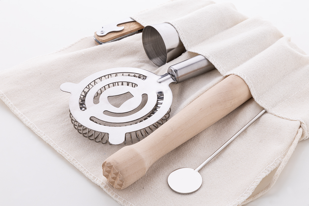 Set da cocktail composto da 5 pezzi contenuti in una pratica confezione avvolgibile in cotone.Il set comprende: un jigger, un colino, un cucchiaio da bar in acciaio inox, un cavatappi con manico in legno ed un pestello in legno.