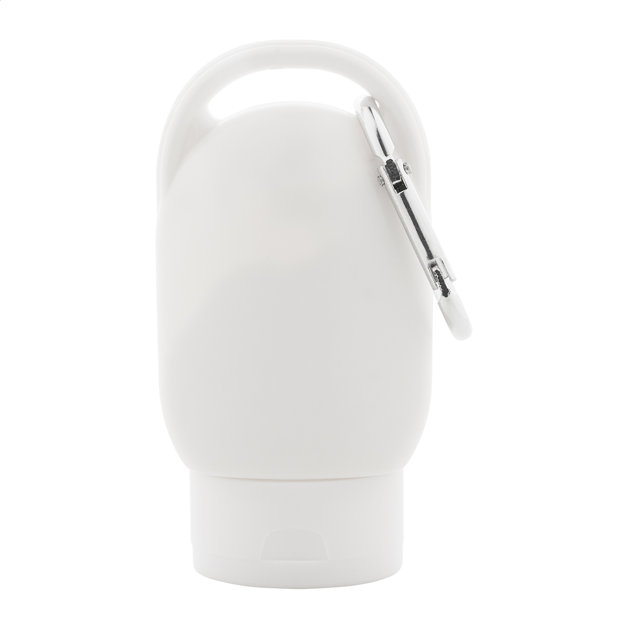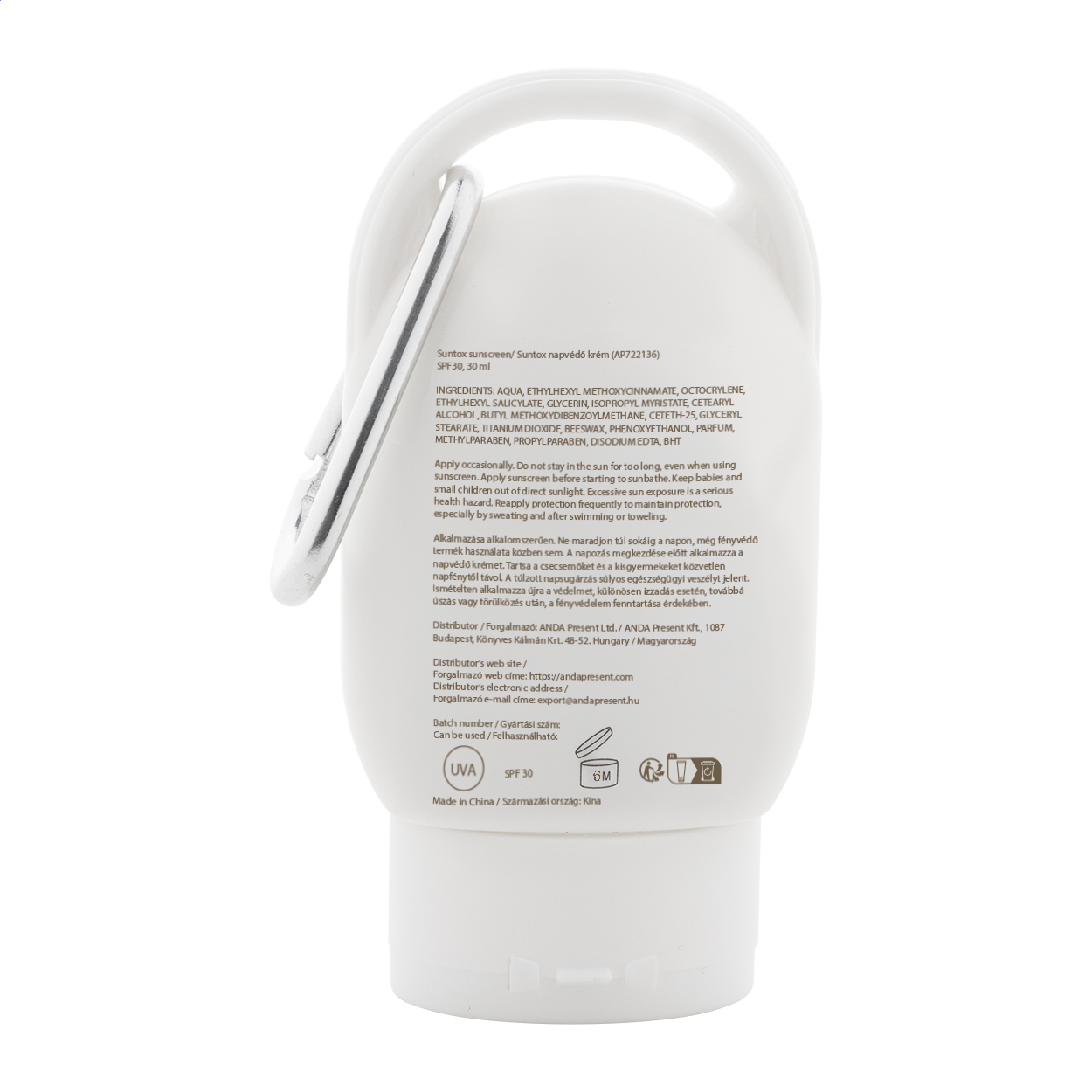 Lozione solare protettiva in contenitore di plastica, tappo e moschettone in colore coordinato. Protezione SPF30, 30 ml.