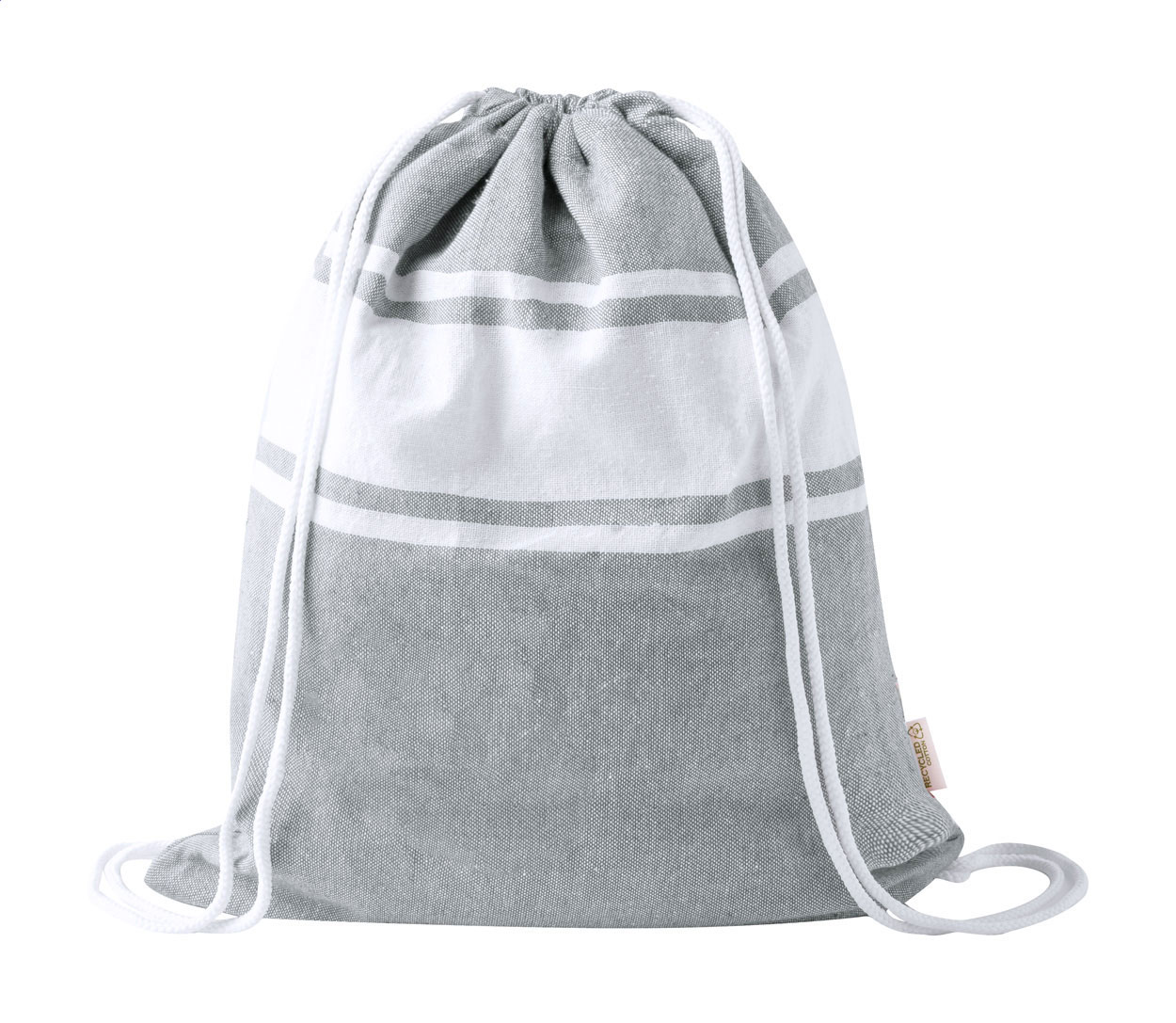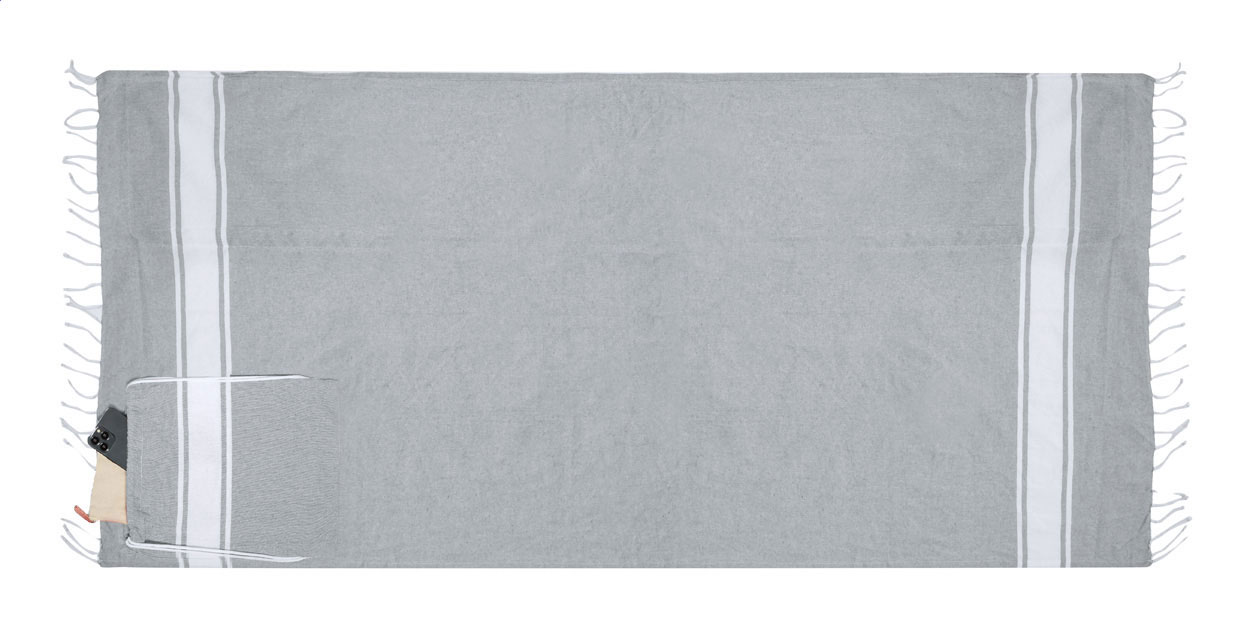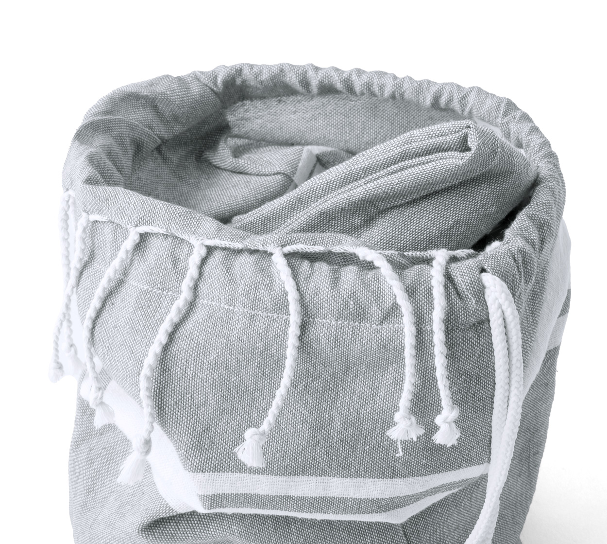 Telo mare pareo bicolore in 100% cotone riciclato 170 g/m² e sacca con chiusura a coulisse coordinata.