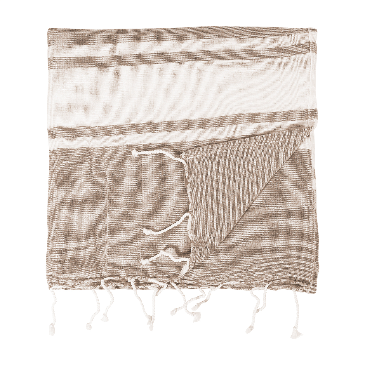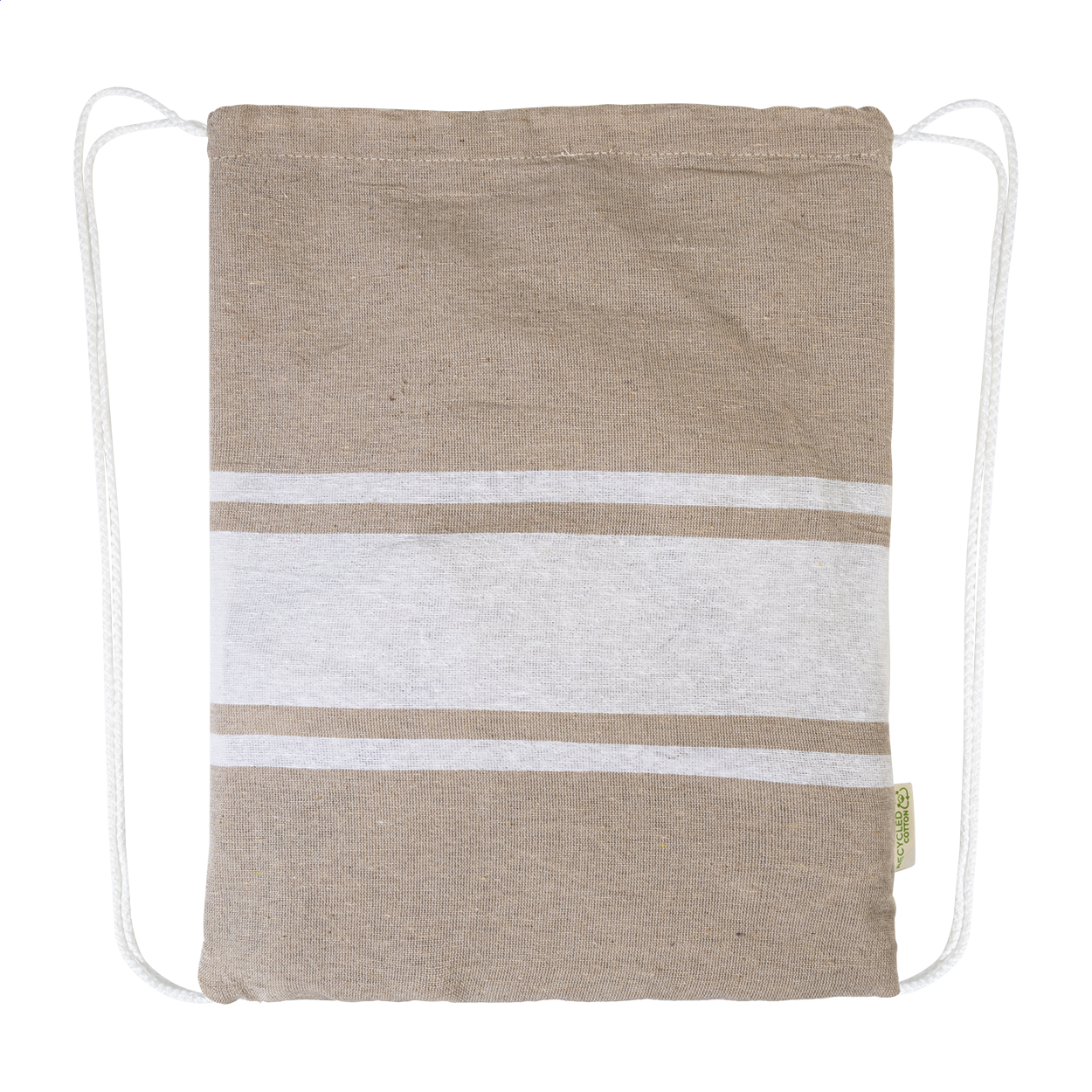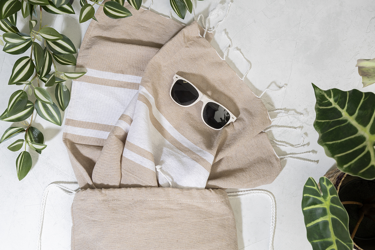 Telo mare pareo bicolore con sacca a coulisse. 70% cotone riciclato e 30% poliestere RPET, 180 g/m².