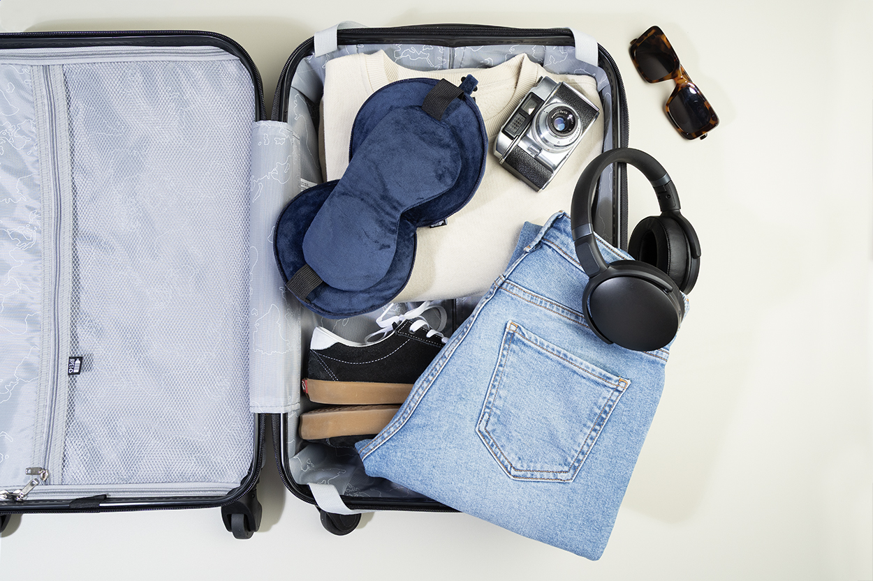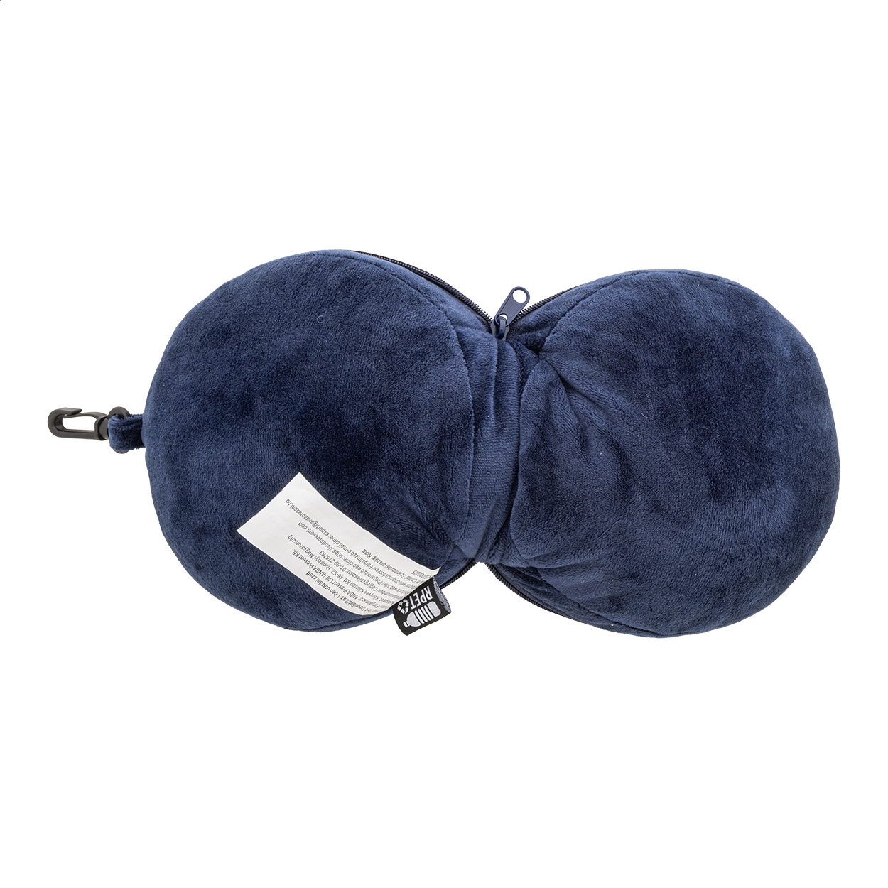 Cuscino da viaggio in poliestere RPET con mascherina per gli occhi integrata, elastici ed etichettaRPET. Il cuscino diventa una sfera compatta per essere riposta facilmente e comprende un moschettone in PP per essere agganciato al bagaglio.