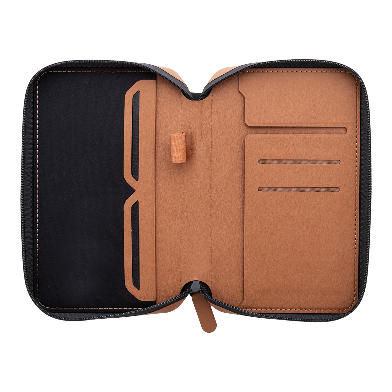 Elegante organizer da viaggio in pelle PU riciclata con cerniera e custodia per passaporti. Offre molteplici tasche interne per documenti, carte ed elementi essenziali per il viaggio.