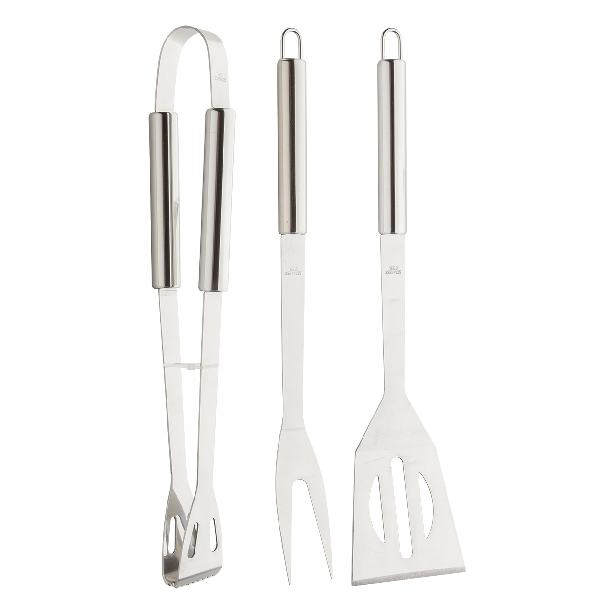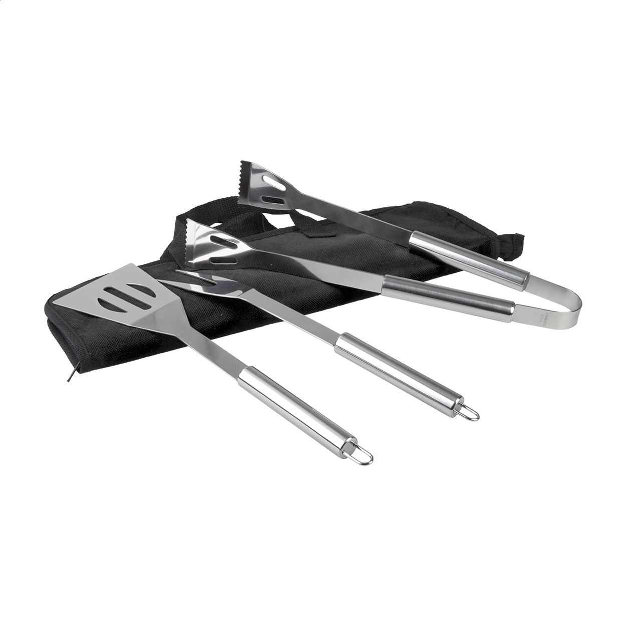 Set barbecue da 5 pz, composto da 3 accessori in acciaio con manico in legno (forchetta, paletta e pinza), un guanto e un grembiule in poliestere.