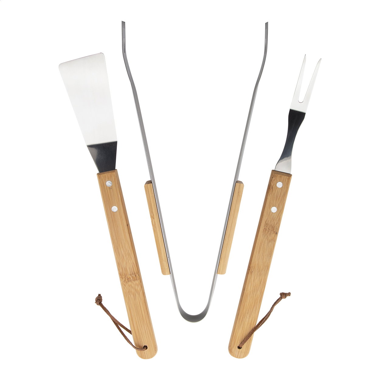 Set barbecue da 3 pezzi in acciaio (forchettone, spatola e pinza) con borsa in nylon e cerniera.