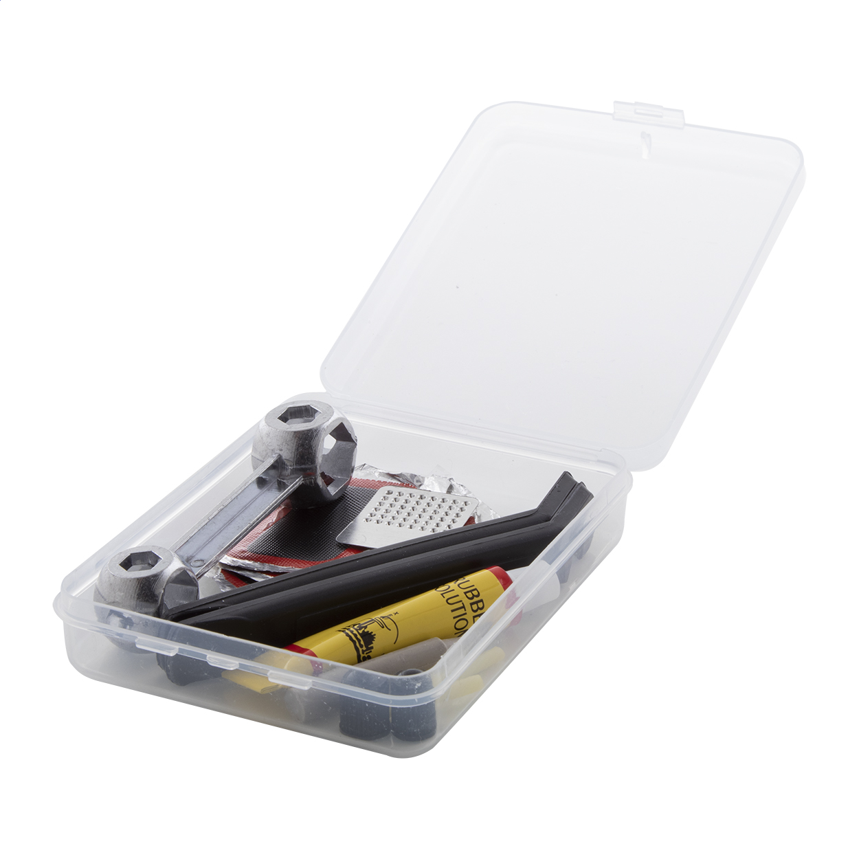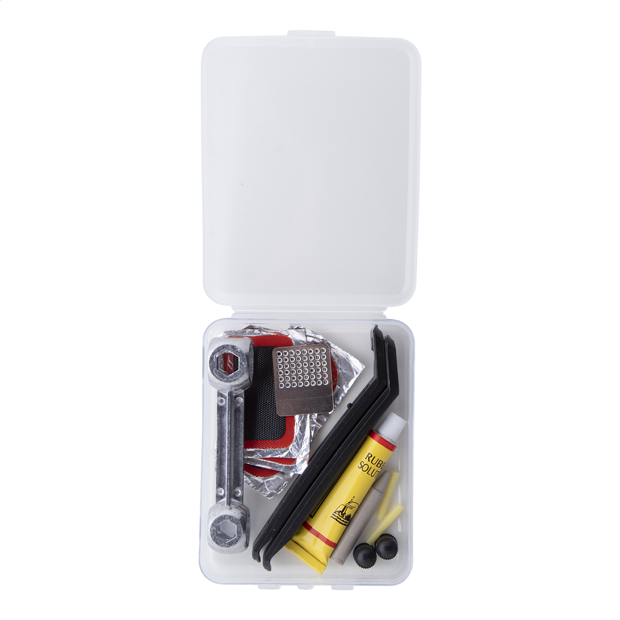 Kit per la riparazione di biciclette in una custodia di plastica PP trasparente. Include una chiave esagonale e un kit per la riparazione delle forature (2 leve per pneumatici, grattugia, colla, 2 tappi per valvole, 2 tubicini per valvole e 5 toppe per pneumatici).