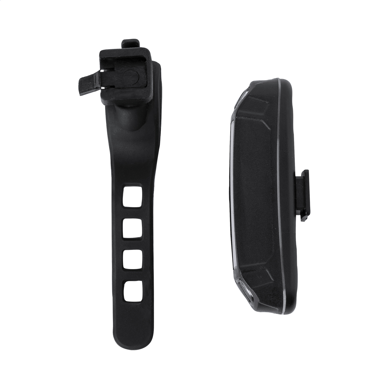 Luce da bicicletta in plastica ABS con proiettore COB ad alta potenza (luce bianca e rossa), batteria ricaricabile USB integrata (350 mAh) e cinghia elastica. Modalità di funzionamento a luce fissa e lampeggiante. Cavo di ricarica USB incluso. Non commercializzato nei seguenti paesi: DE, AT, CH.