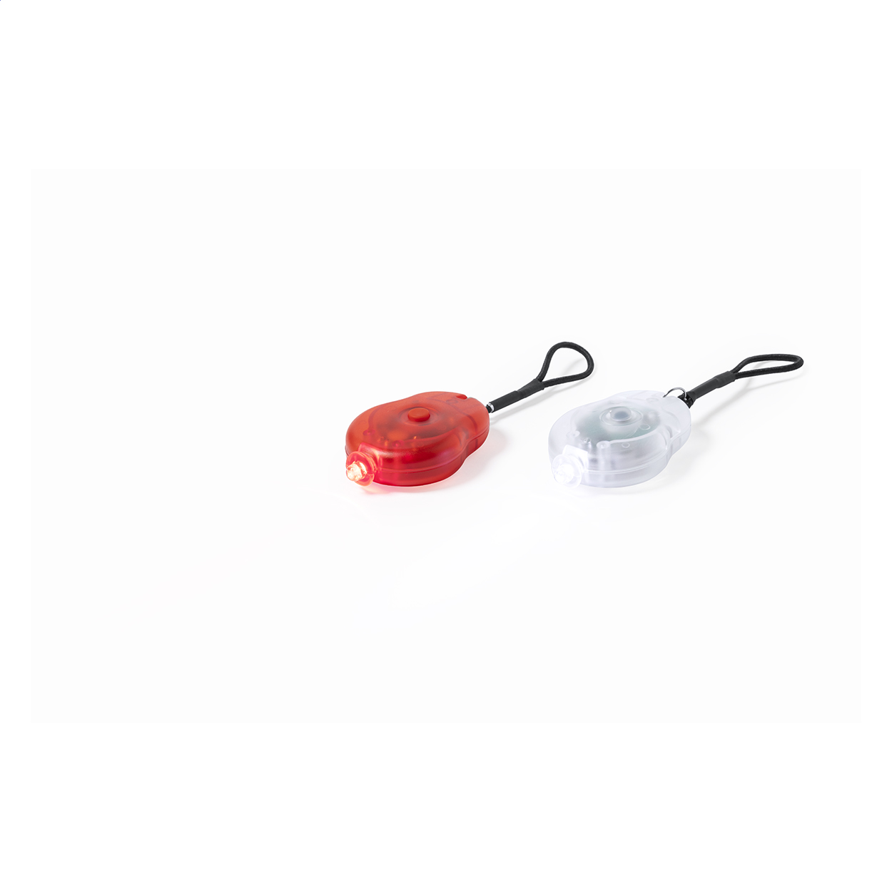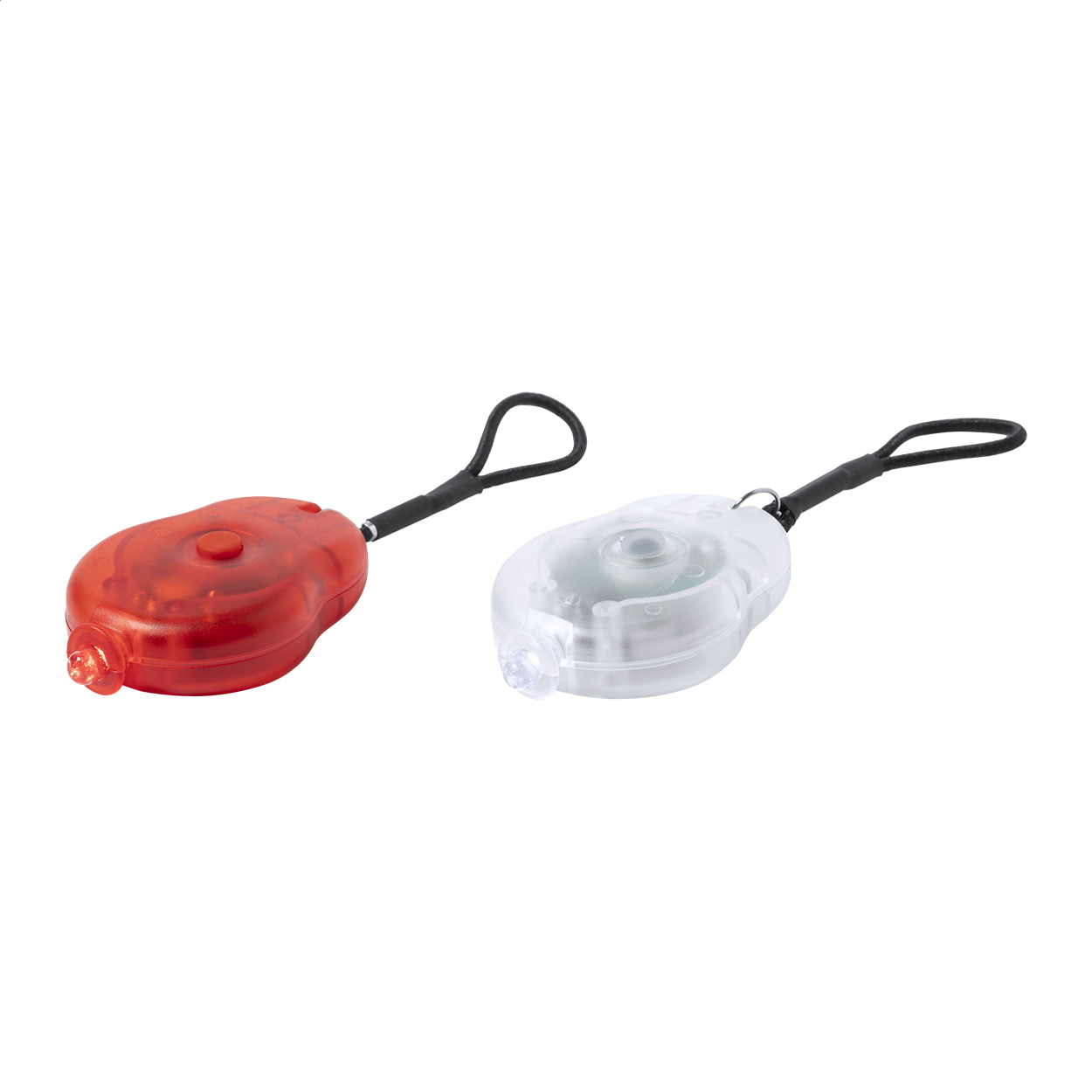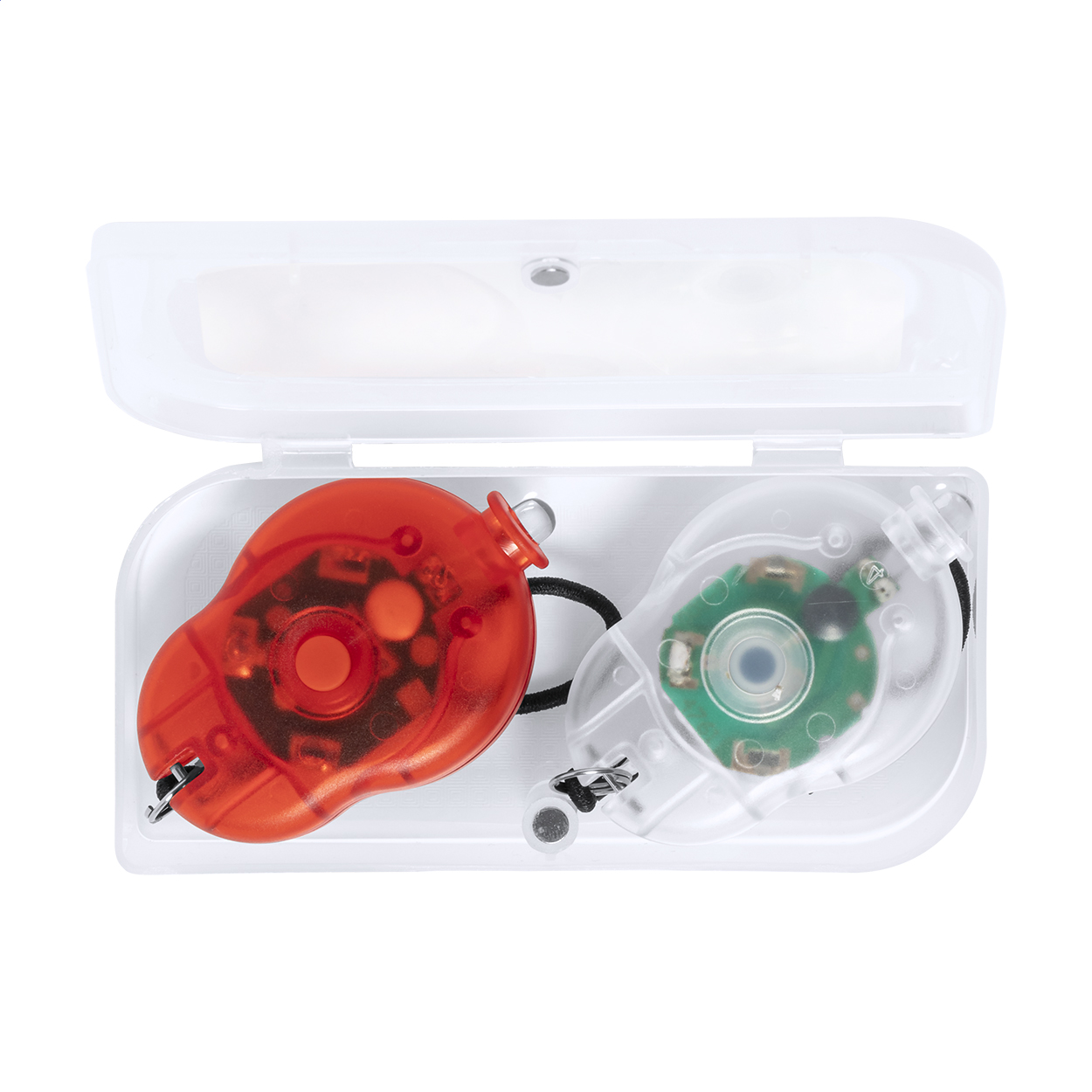 Set di 2 luci per bicicletta in una custodia di plastica PP. Comprende 1 luce LED bianca e 1 rossa con cinturini elastici e 2 modalità di illuminazione. Fornito con 2 batterie a bottone.