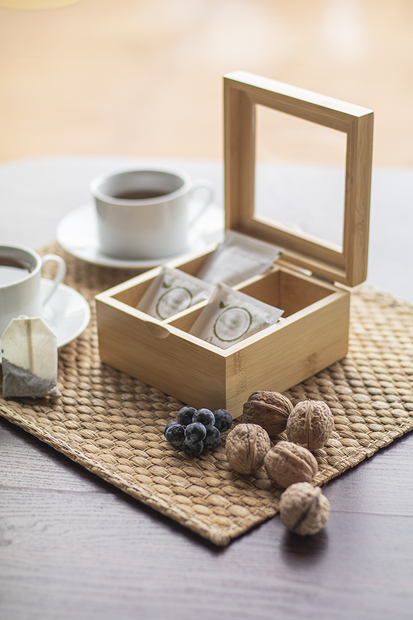 Scatola per il tè in bambù con coperchio in acrilico trasparente e 4 scomparti.