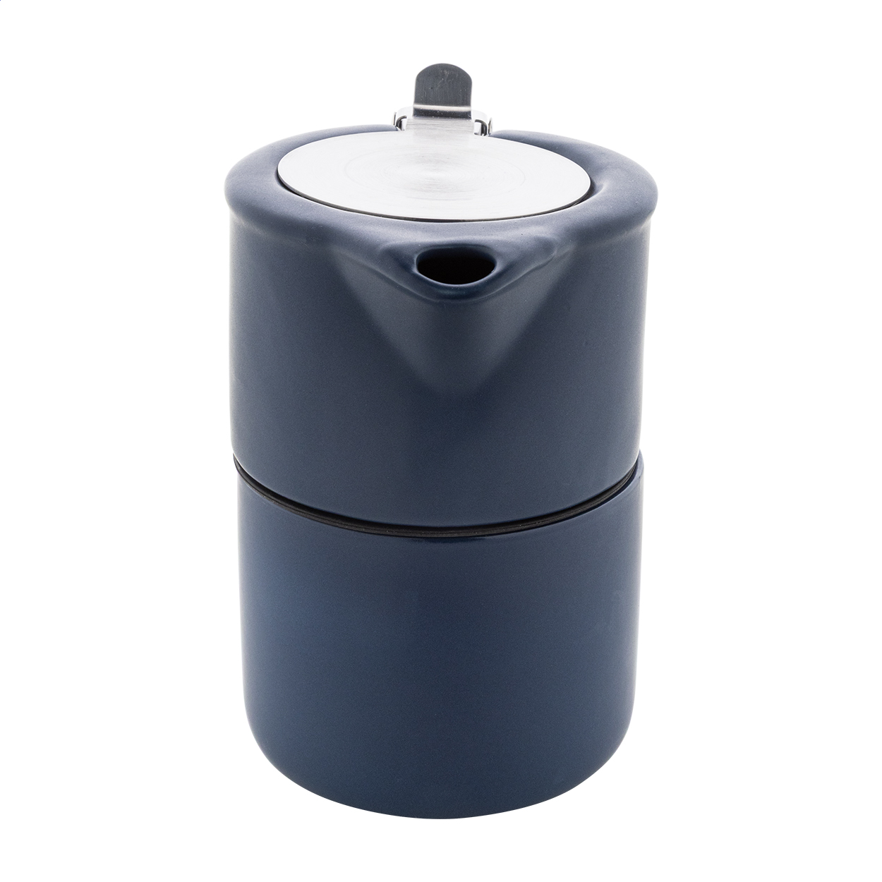 Set da tè in ceramica di alta qualità con finitura opaca. Il set comprende una teiera (430 ml) con coperchio e colino in acciaio, che può essere impilata in modo ordinato sopra la sua tazza coordinata (400 ml). Il set viene fornito in scatola di cartoncino kraft.