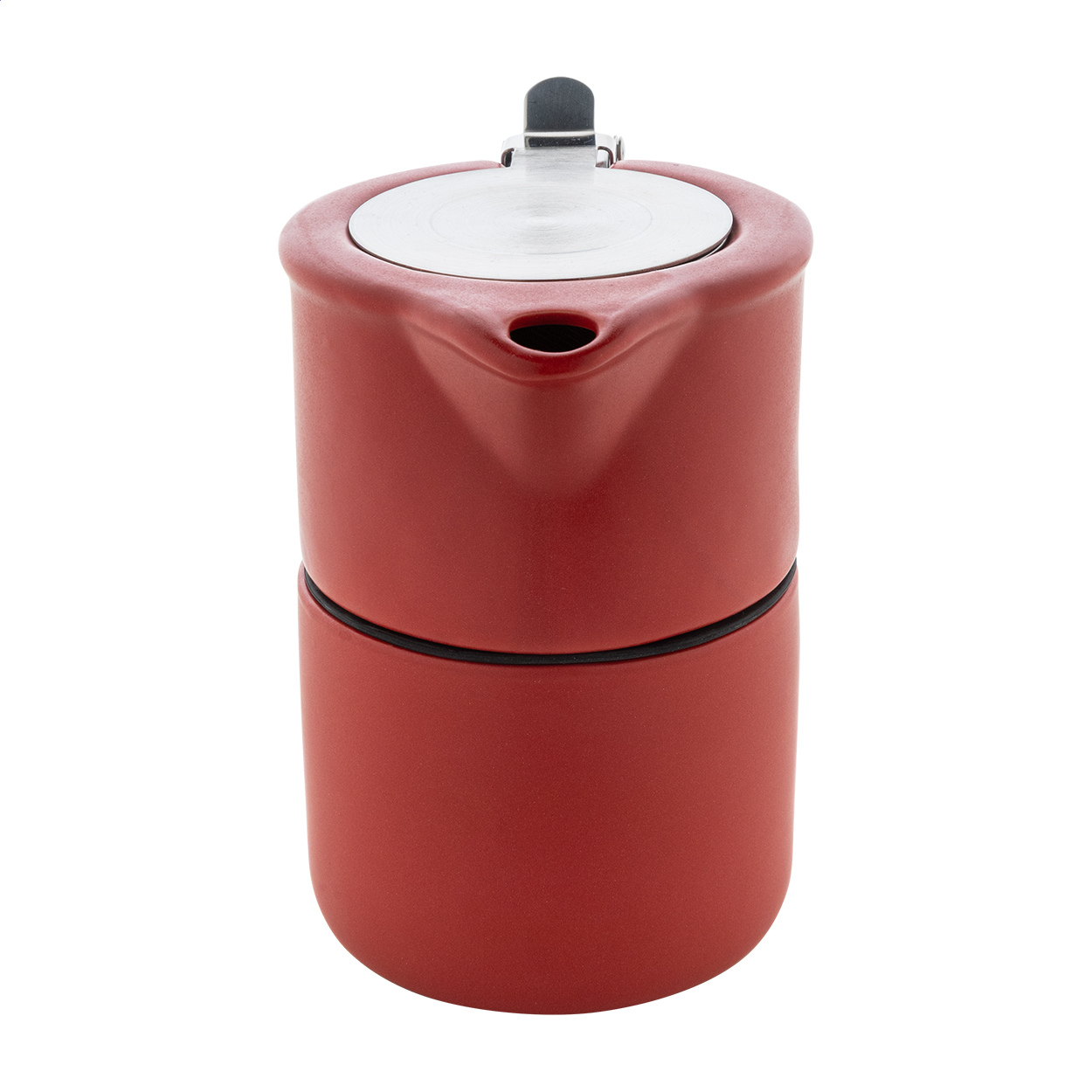 Set da tè in ceramica di alta qualità con finitura opaca. Il set comprende una teiera (430 ml) con coperchio e colino in acciaio, che può essere impilata in modo ordinato sopra la sua tazza coordinata (400 ml). Il set viene fornito in scatola di cartoncino kraft.