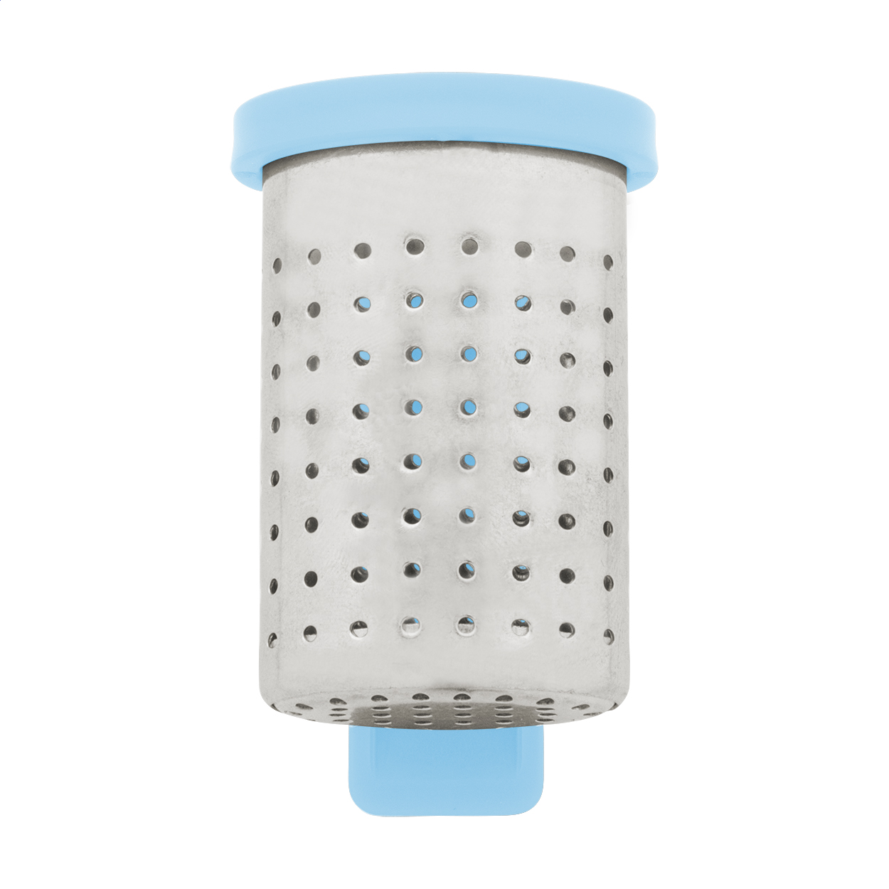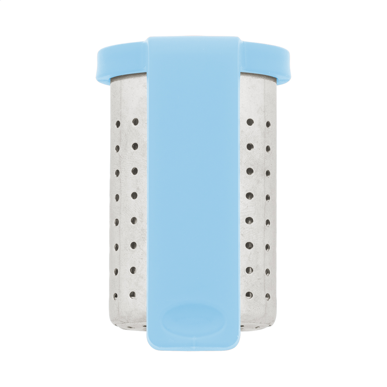 Infusore per tè in acciaio con pratico supporto a clip in ABS riciclato. Progettato per essere facilmente agganciato al bordo di una tazza.