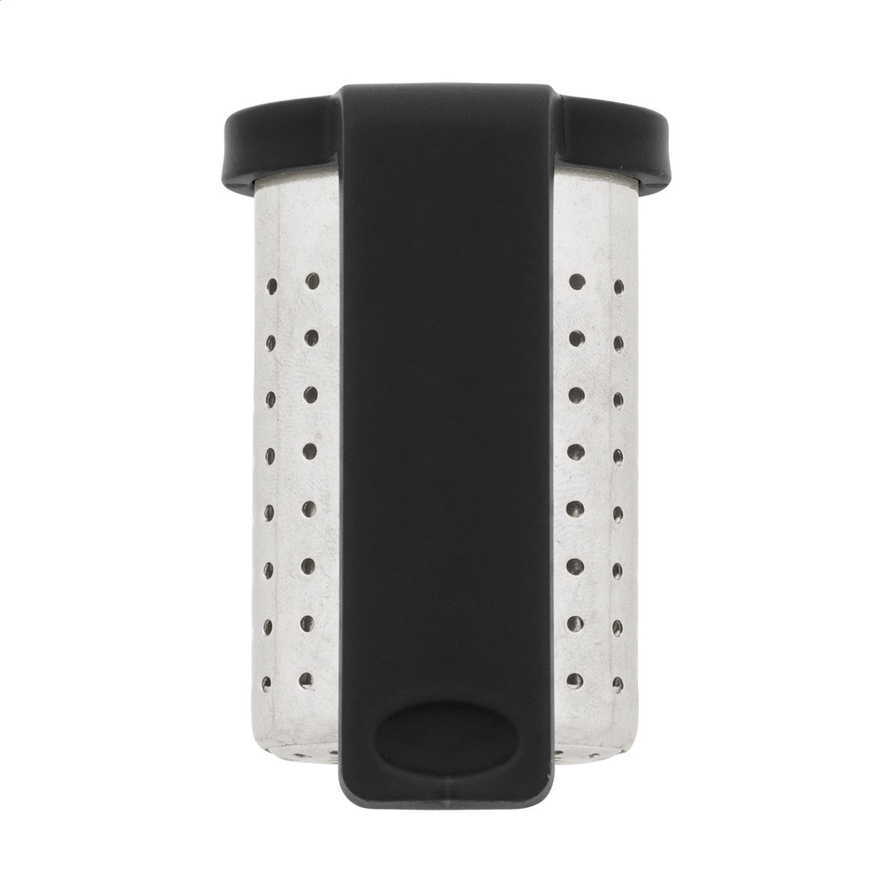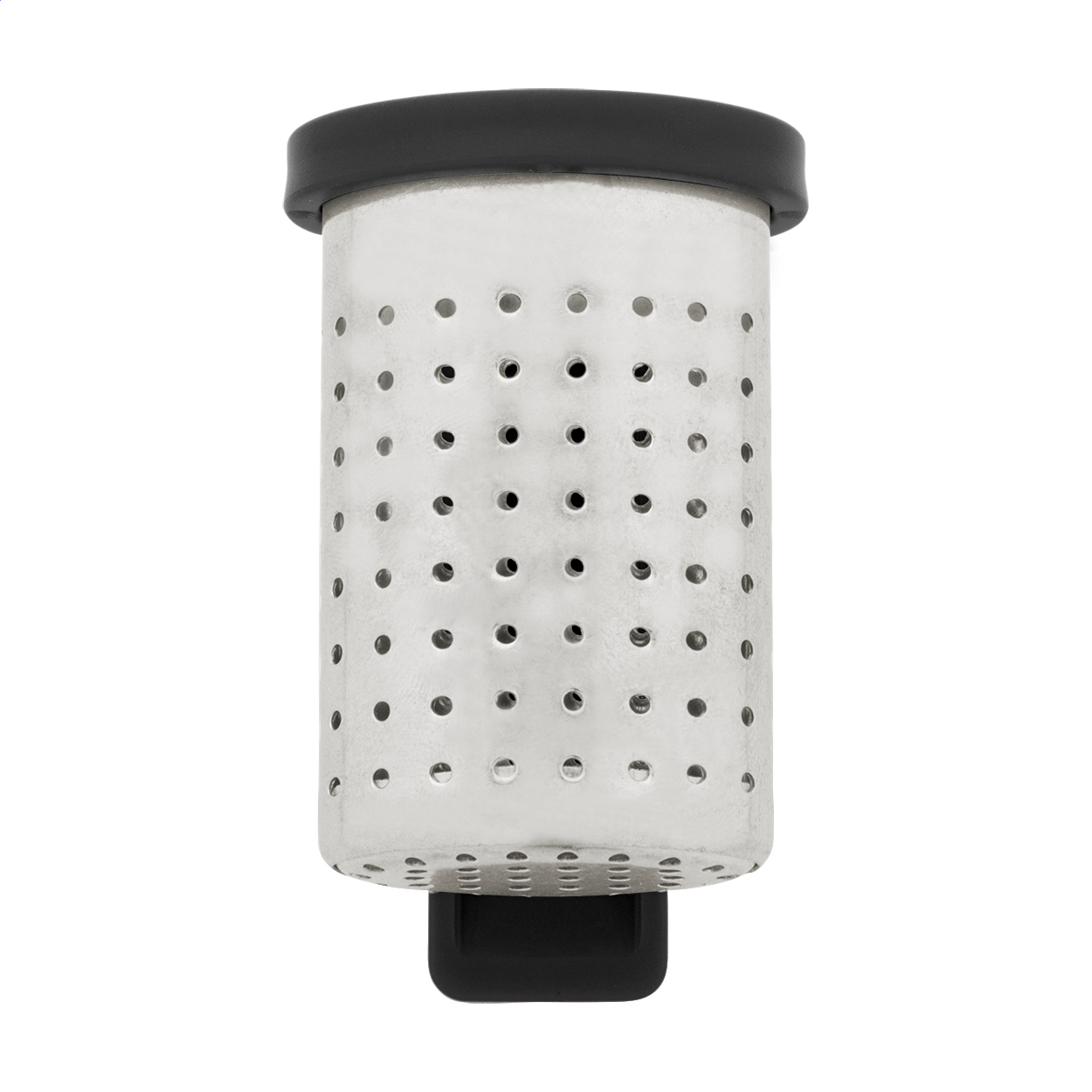 Infusore per tè in acciaio con pratico supporto a clip in ABS riciclato. Progettato per essere facilmente agganciato al bordo di una tazza.