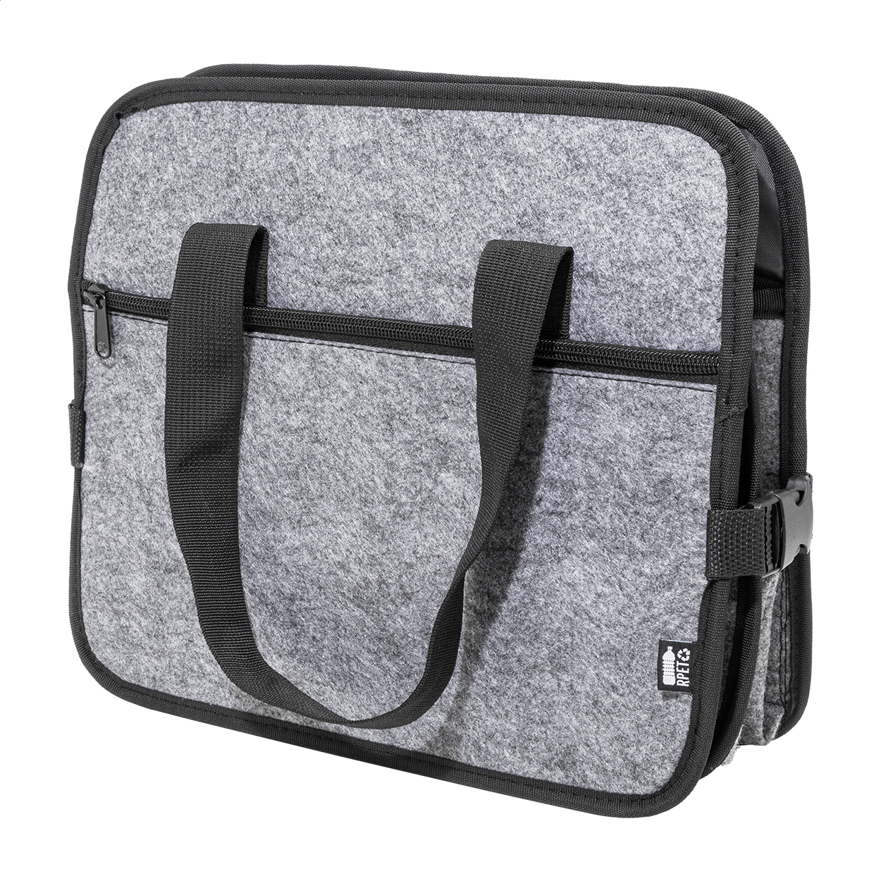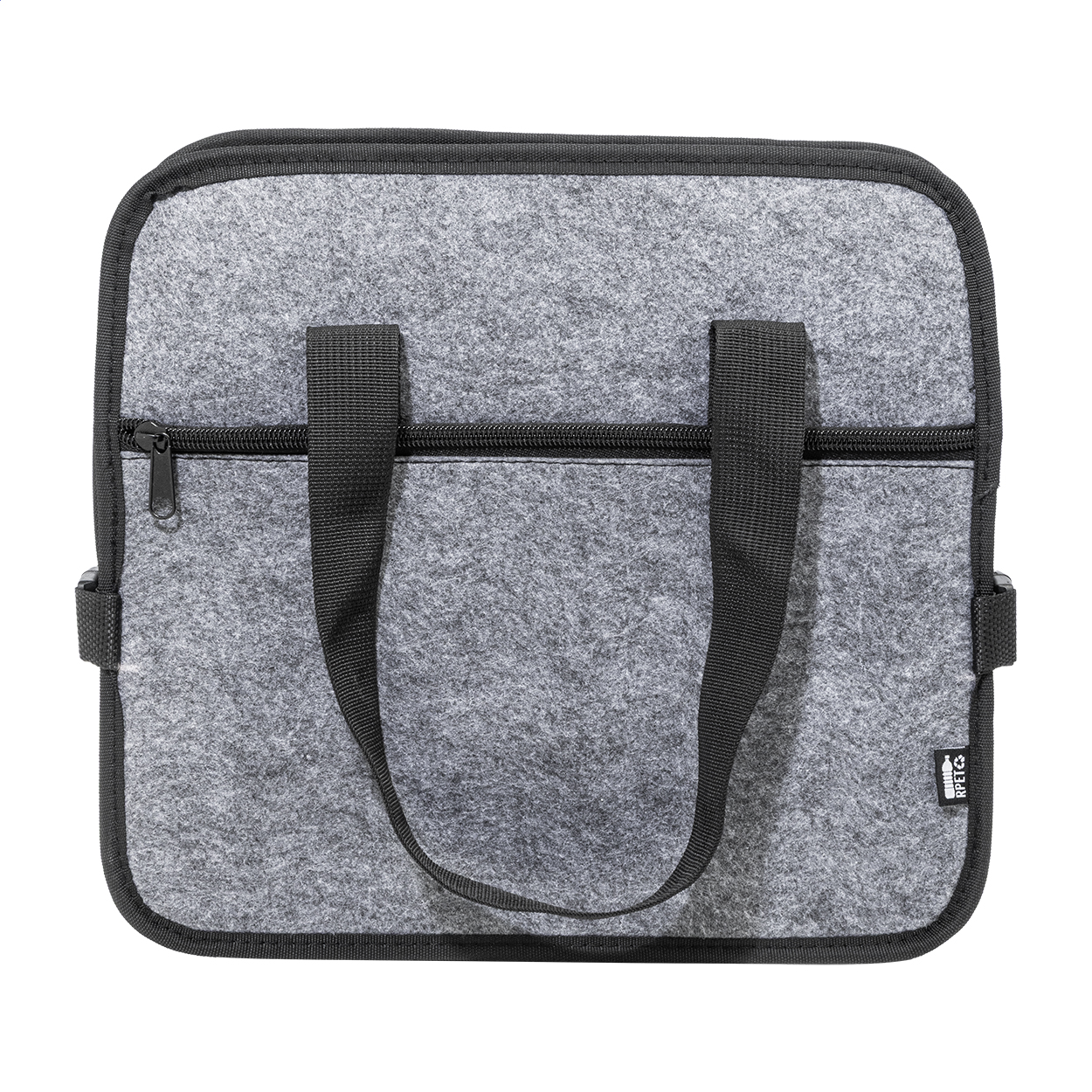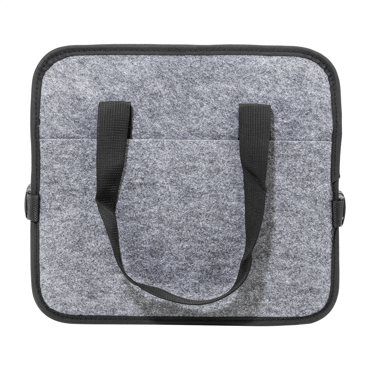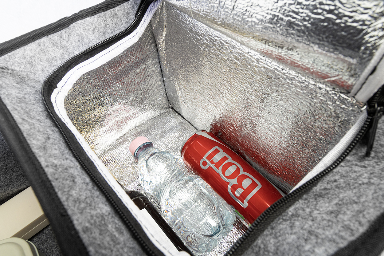 Organizer in feltro RPET pieghevole per il bagagliaio dell'auto, con tasca anteriore chiusa da cerniera, manici lunghi, fibbie laterali per riporlo comodamente ed etichetta RPET. Comprende uno scomparto aperto e uno scomparto refrigerato con imbottitura in alluminio chiuso da cerniera.