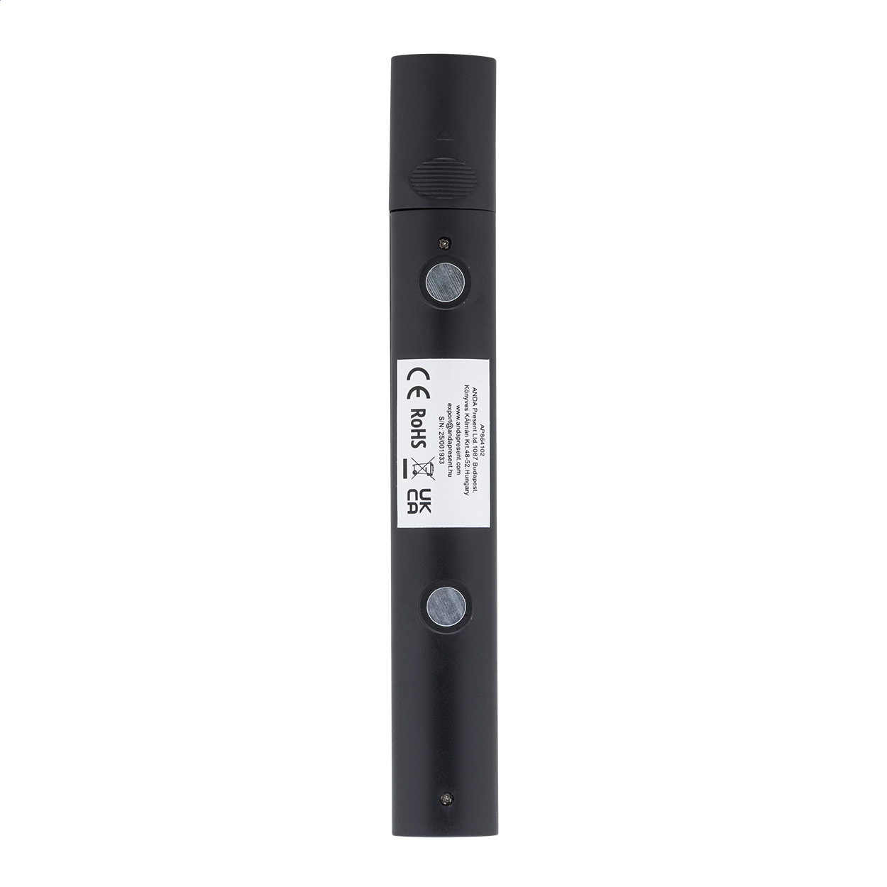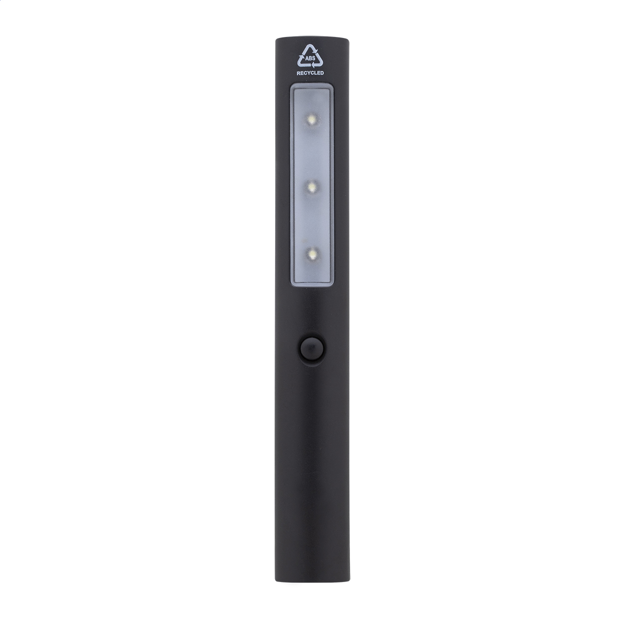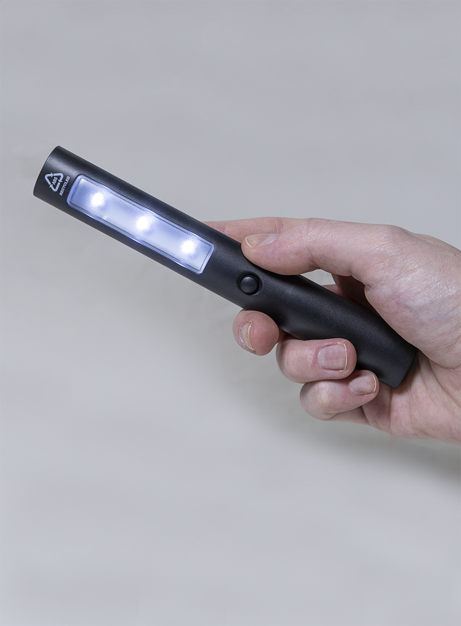 Torcia di emergenza per auto in ABS riciclato con 3 LED e magneti sul retro. Fornita completa di batterie a bottone