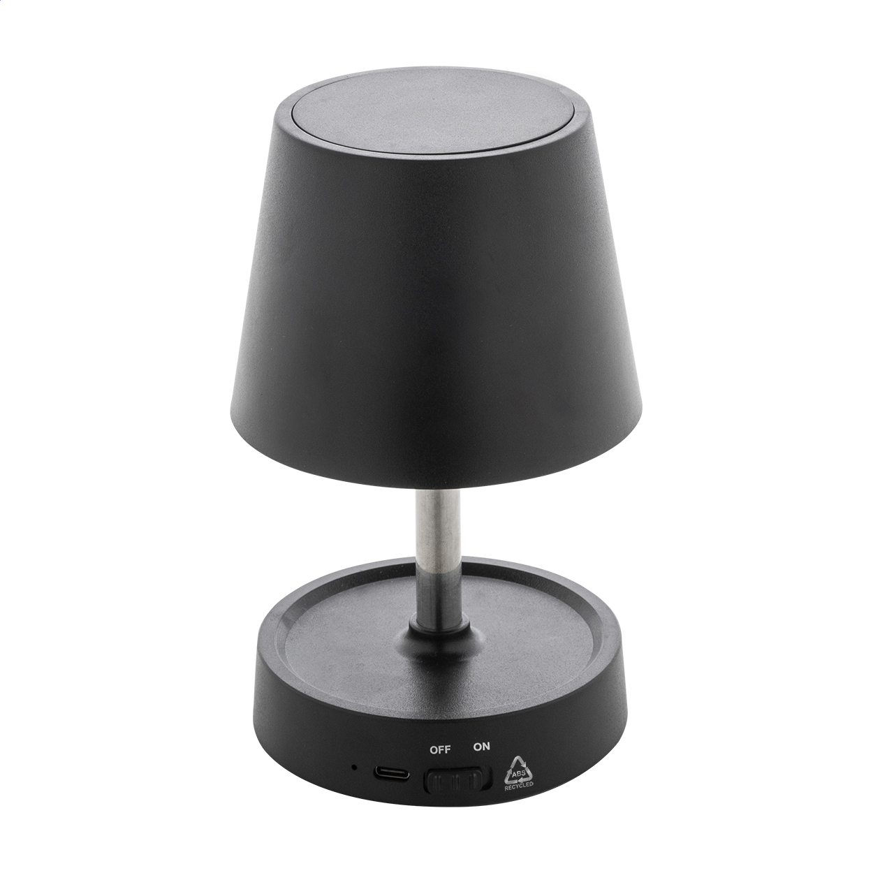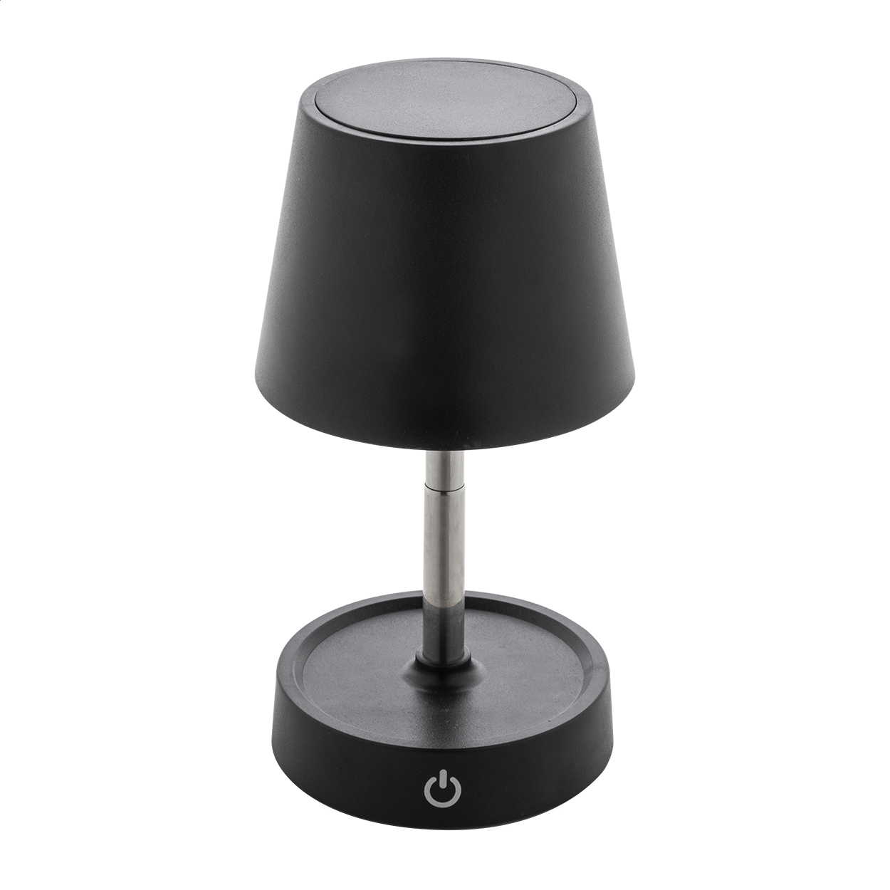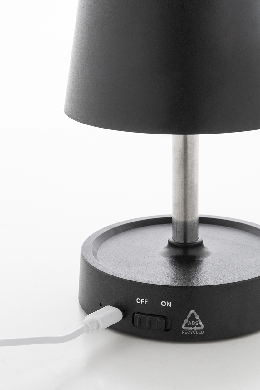 Lampada da tavolo telescopica in ABS riciclato con 12 LED, luminosità regolabile e batteria ricaricabile USB da 1200 mAh. Include cavo di ricarica USB.