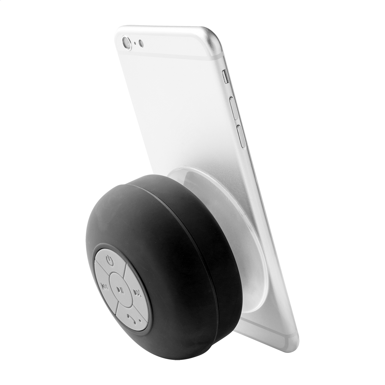 Cassa wireless con alloggiamento rivestito in gomma e ampia ventosa. Con funzione di chiamata in vivavoce e batteria ricaricabile integrata. Cavo di ricarica USB incluso.