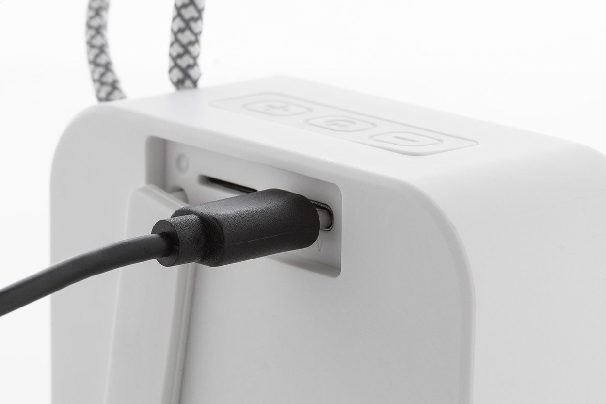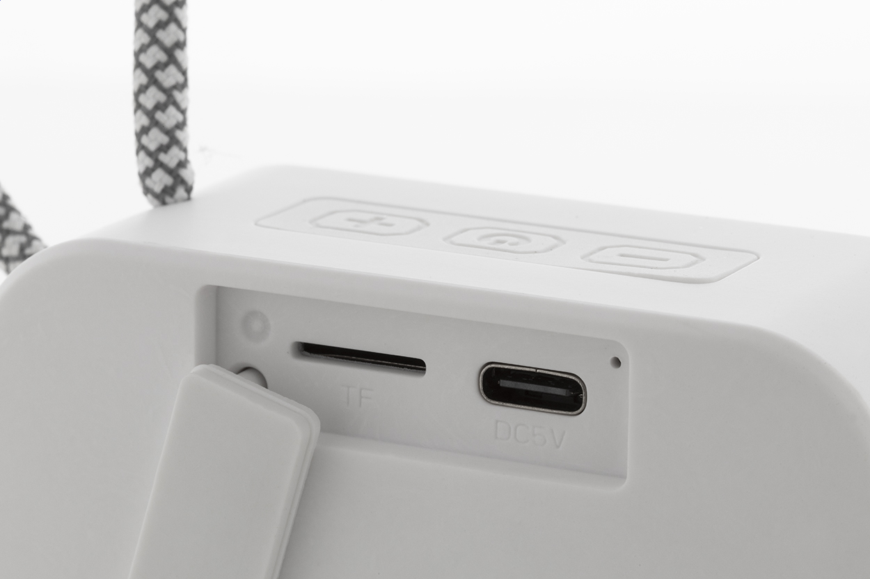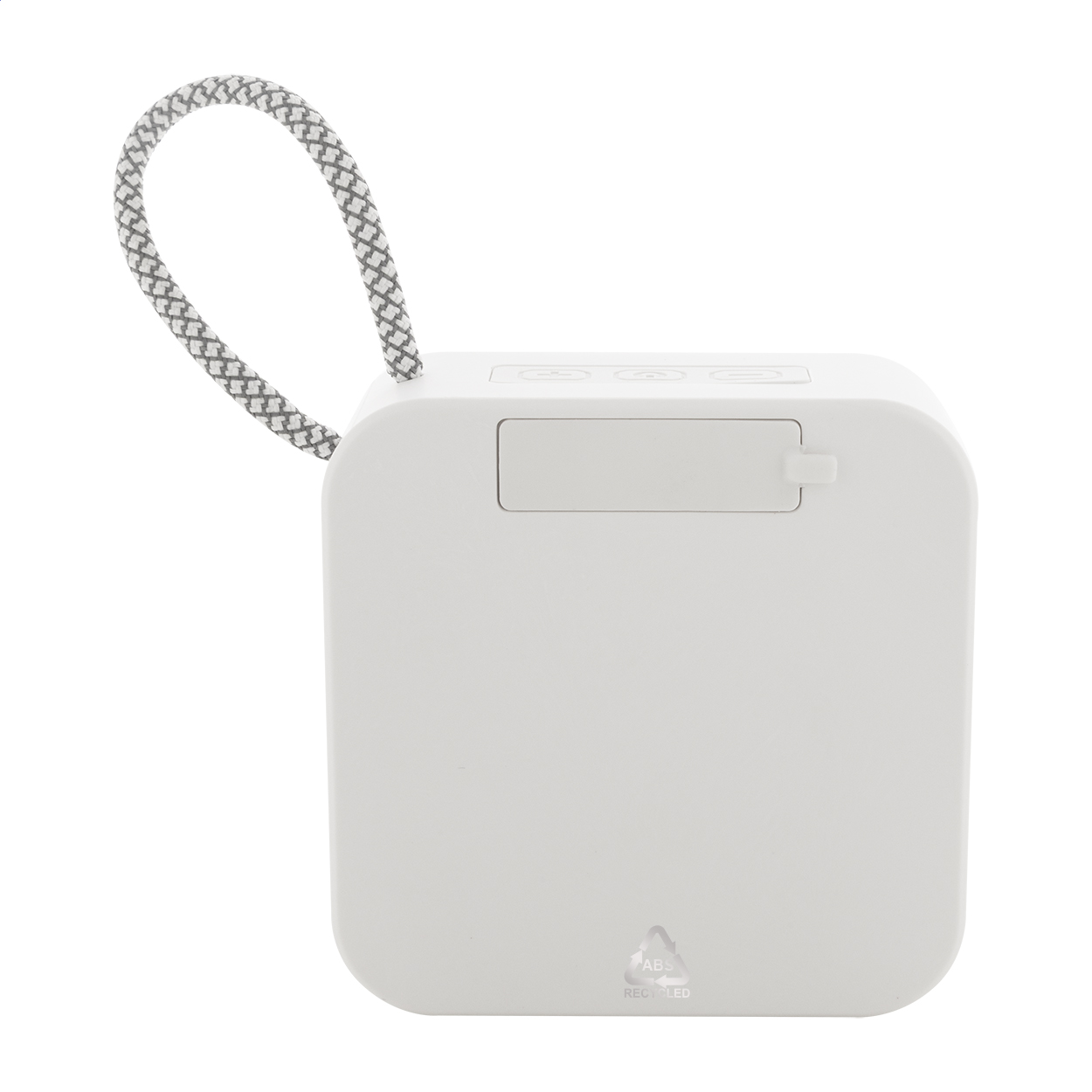 Cassa wireless in ABS riciclato con griglia metallica, batteria ricaricabile (300 mAh) e funzione di riproduzione micro SD MP3. Cavo di ricarica USB incluso.