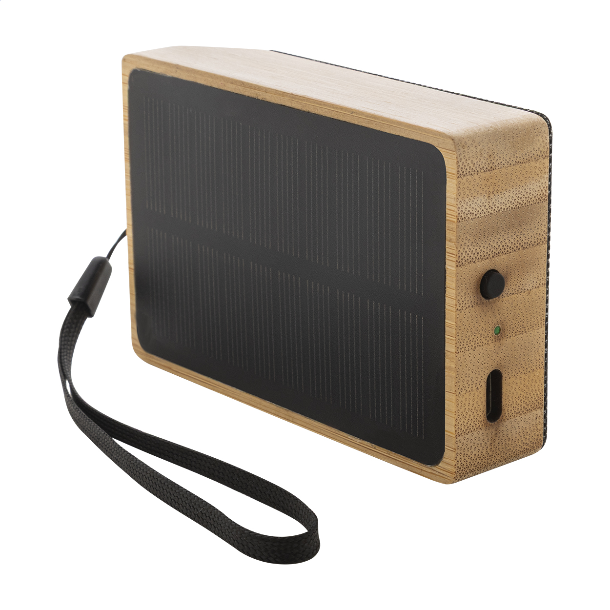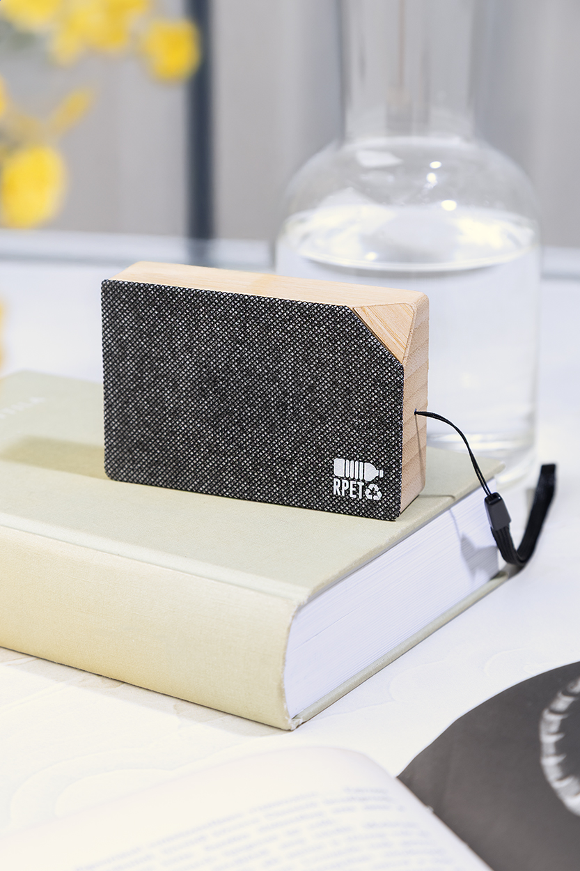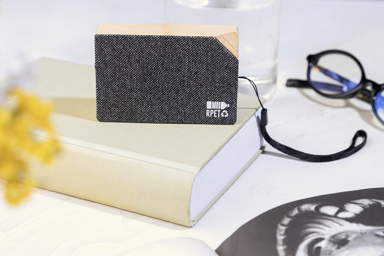 Cassa wireless in bambù con tessuto in poliestere RPET, caricatore solare integrato e batteria ricaricabile (300 mAh). Cavo di ricarica USB Incluso