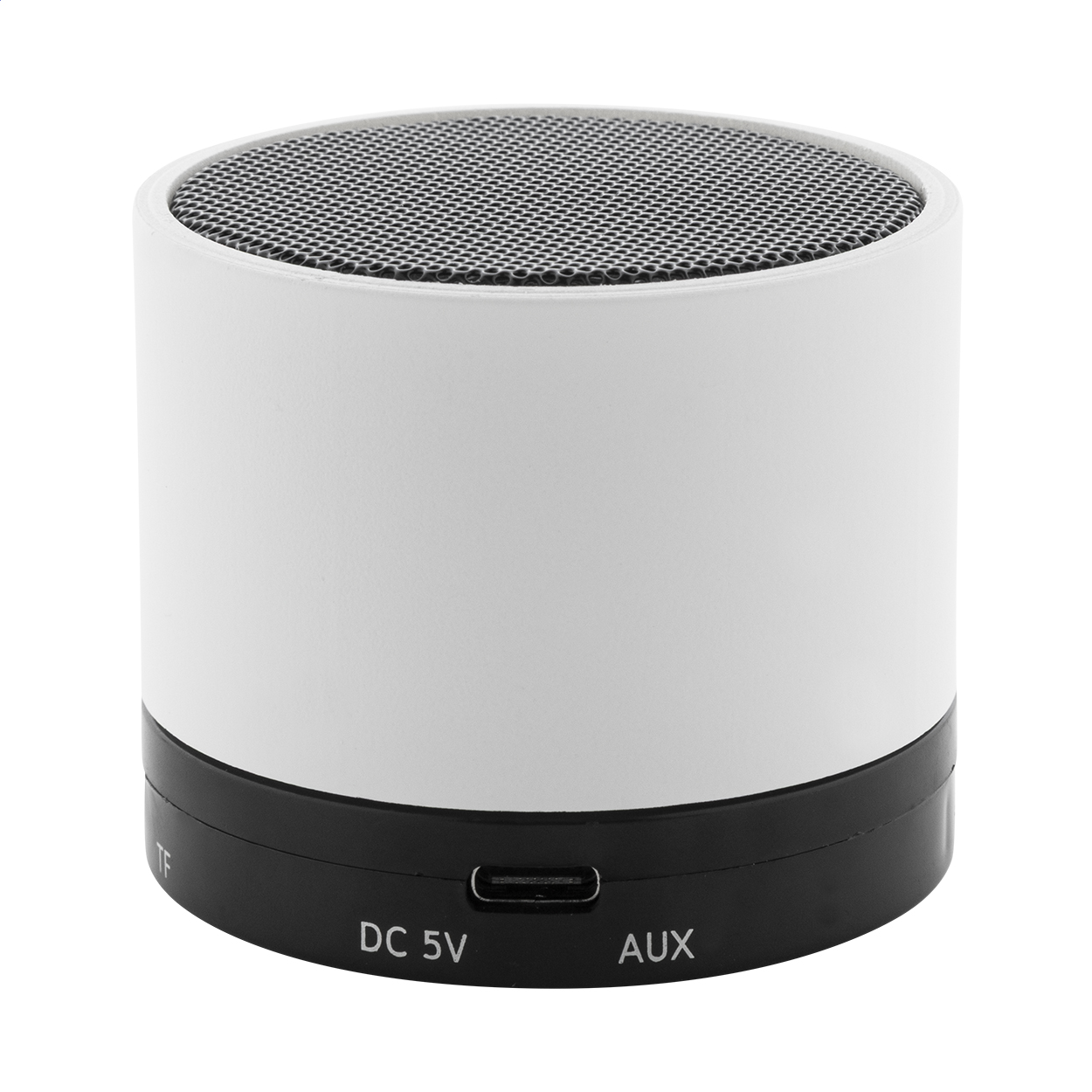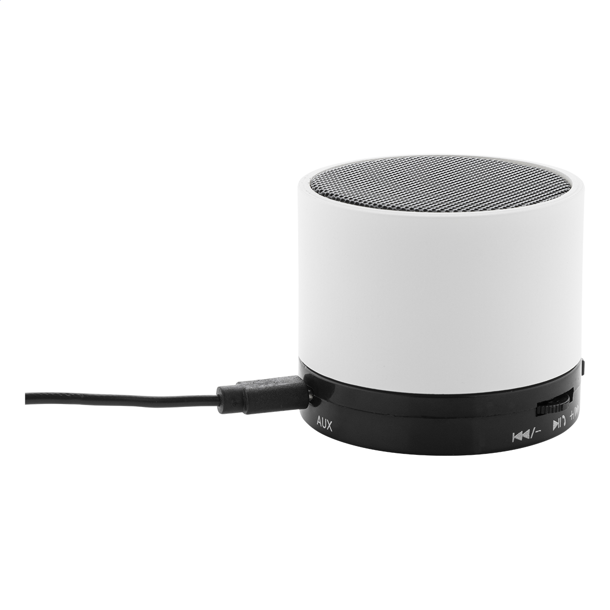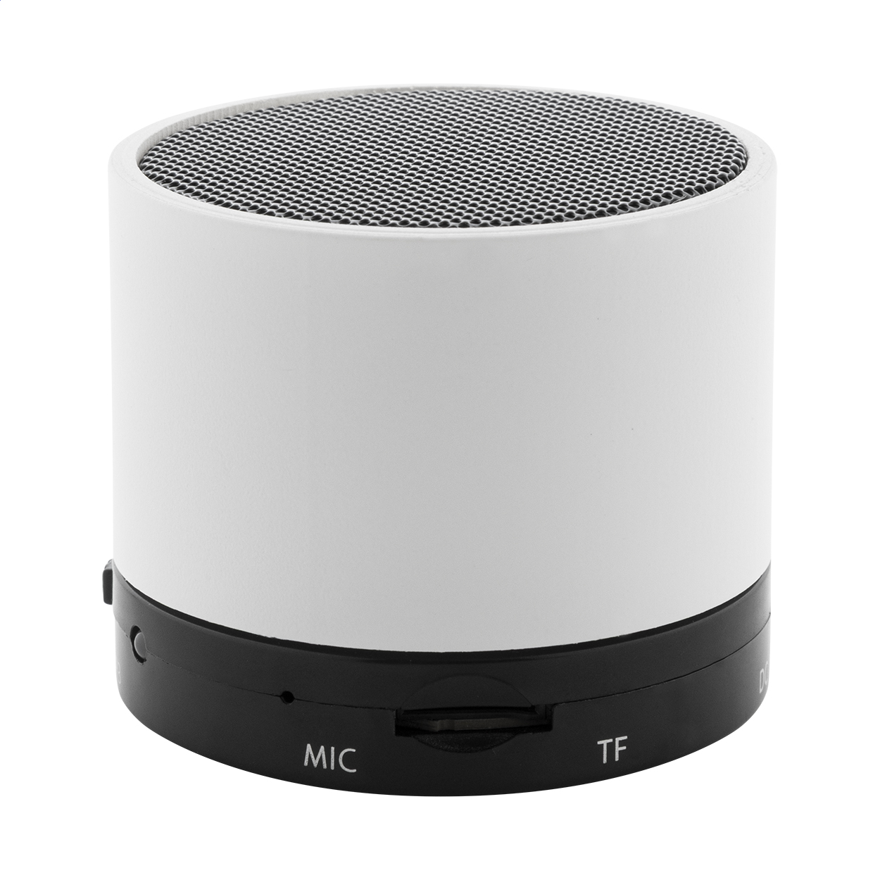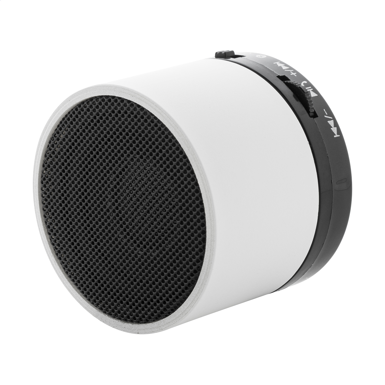 Cassa wireless in ABS riciclato con corpo gommato, rete metallica e batteria ricaricabile (300 mAh). Con funzione di chiamata in vivavoce e riproduzione di MP3 su micro SD. Cavo di ricarica USB incluso.