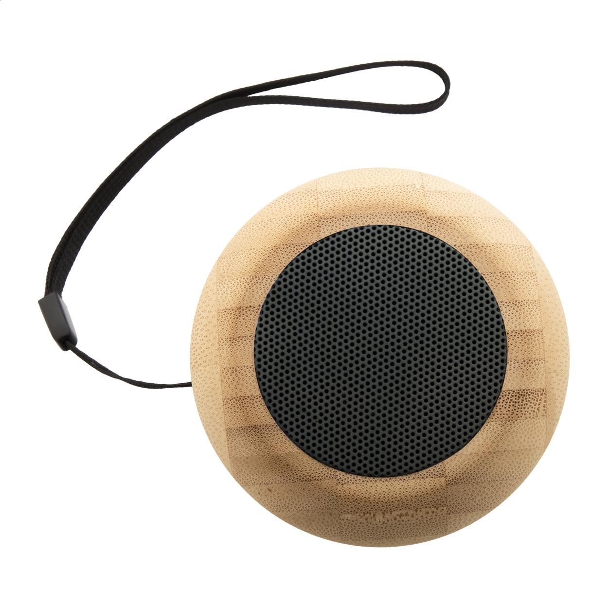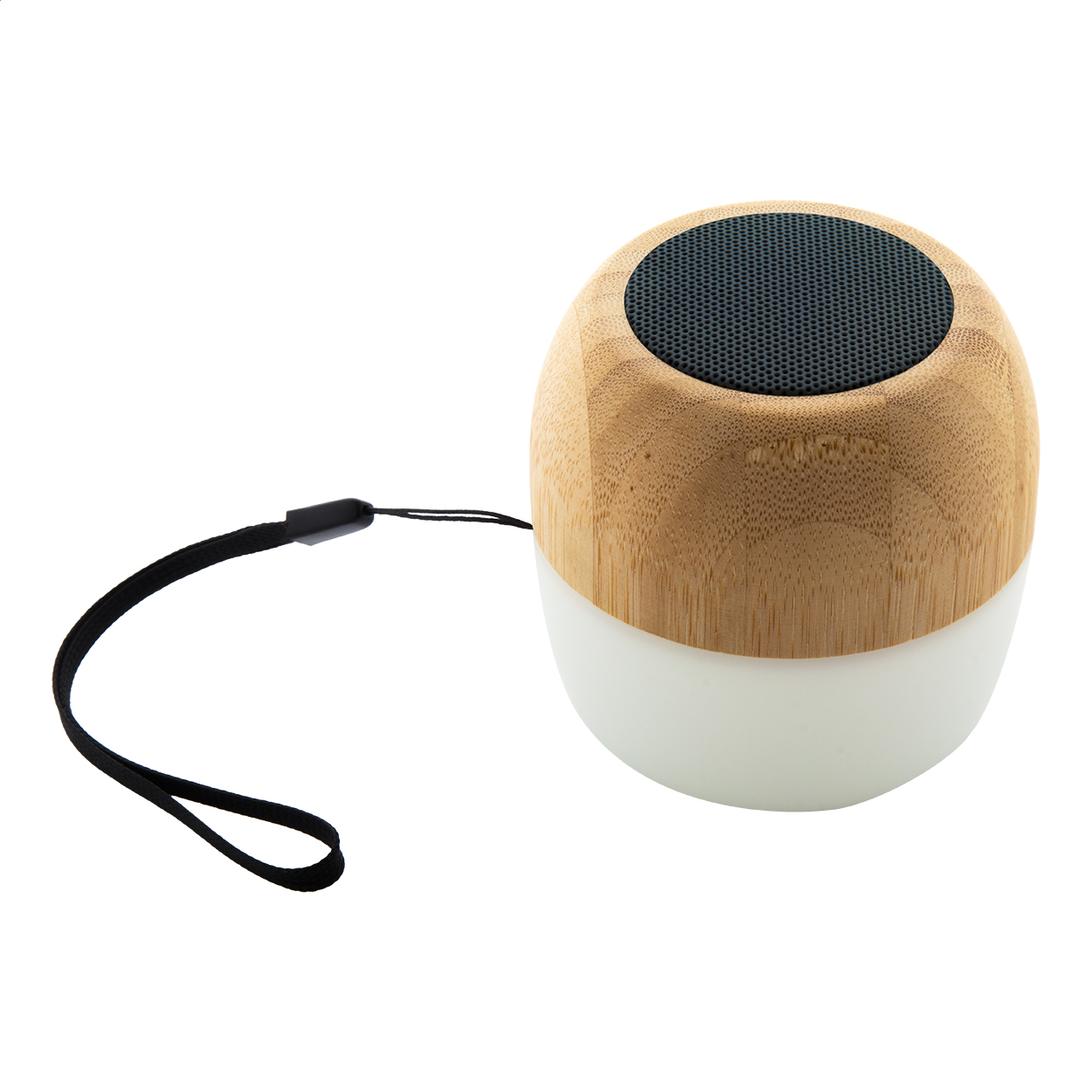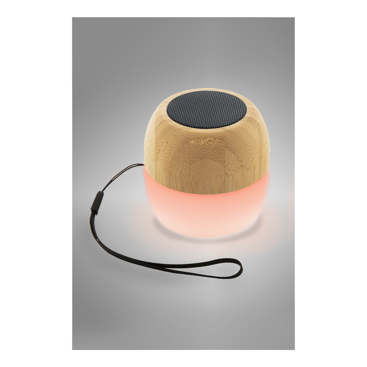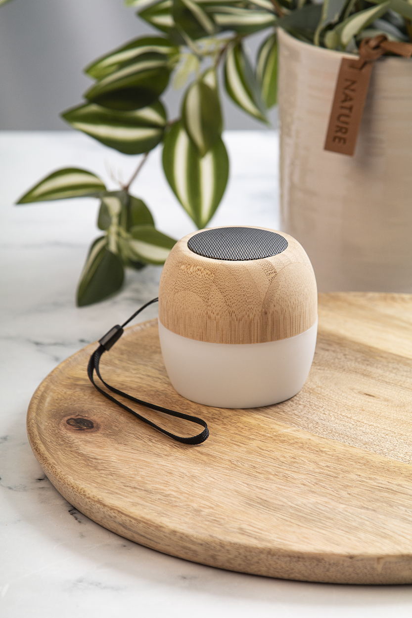 Cassa wireless in plastica ABS riciclata e involucro di bambù con luce LED multicolore sul fondo. Con tracolla e batteria ricaricabile integrata. Cavo di ricarica USB incluso.