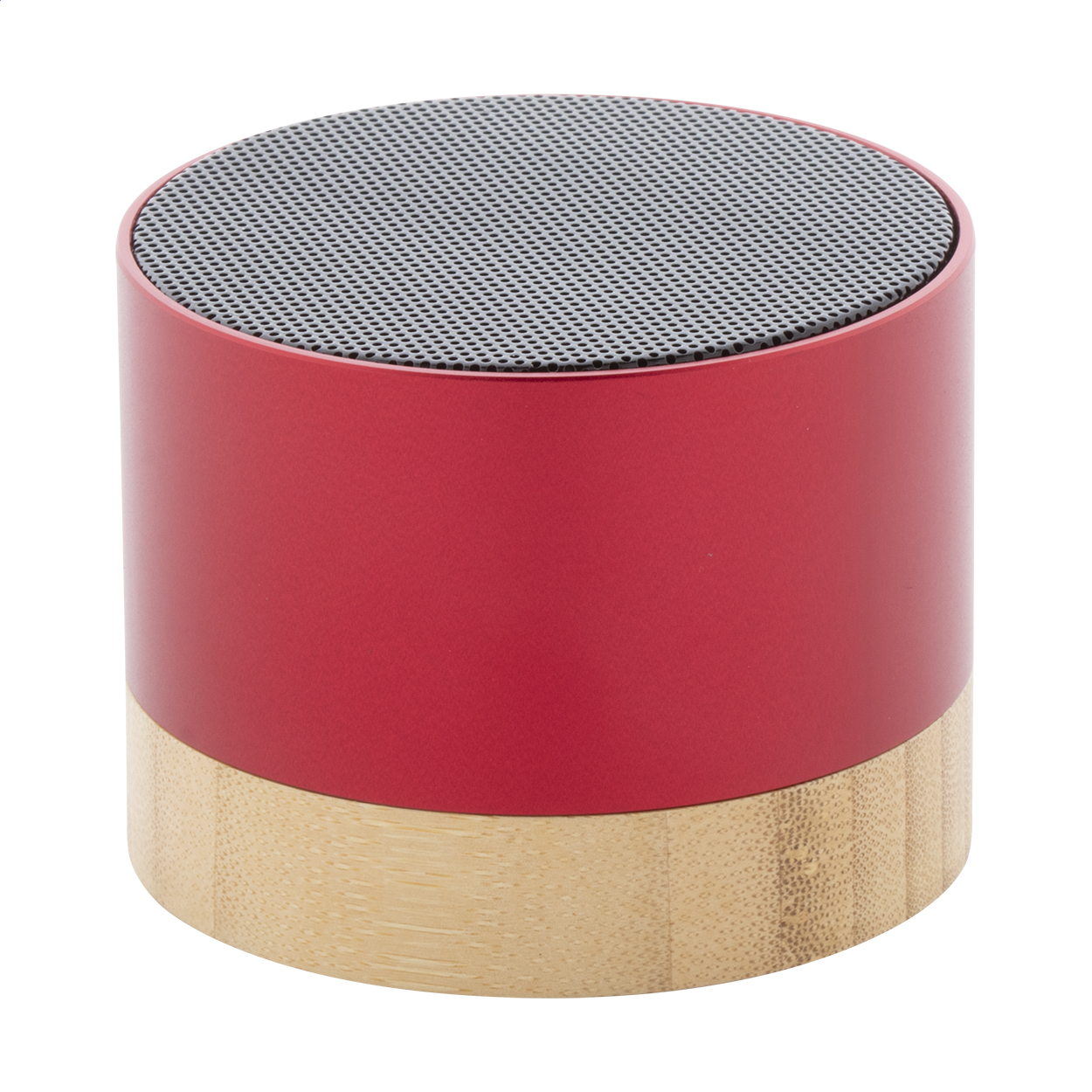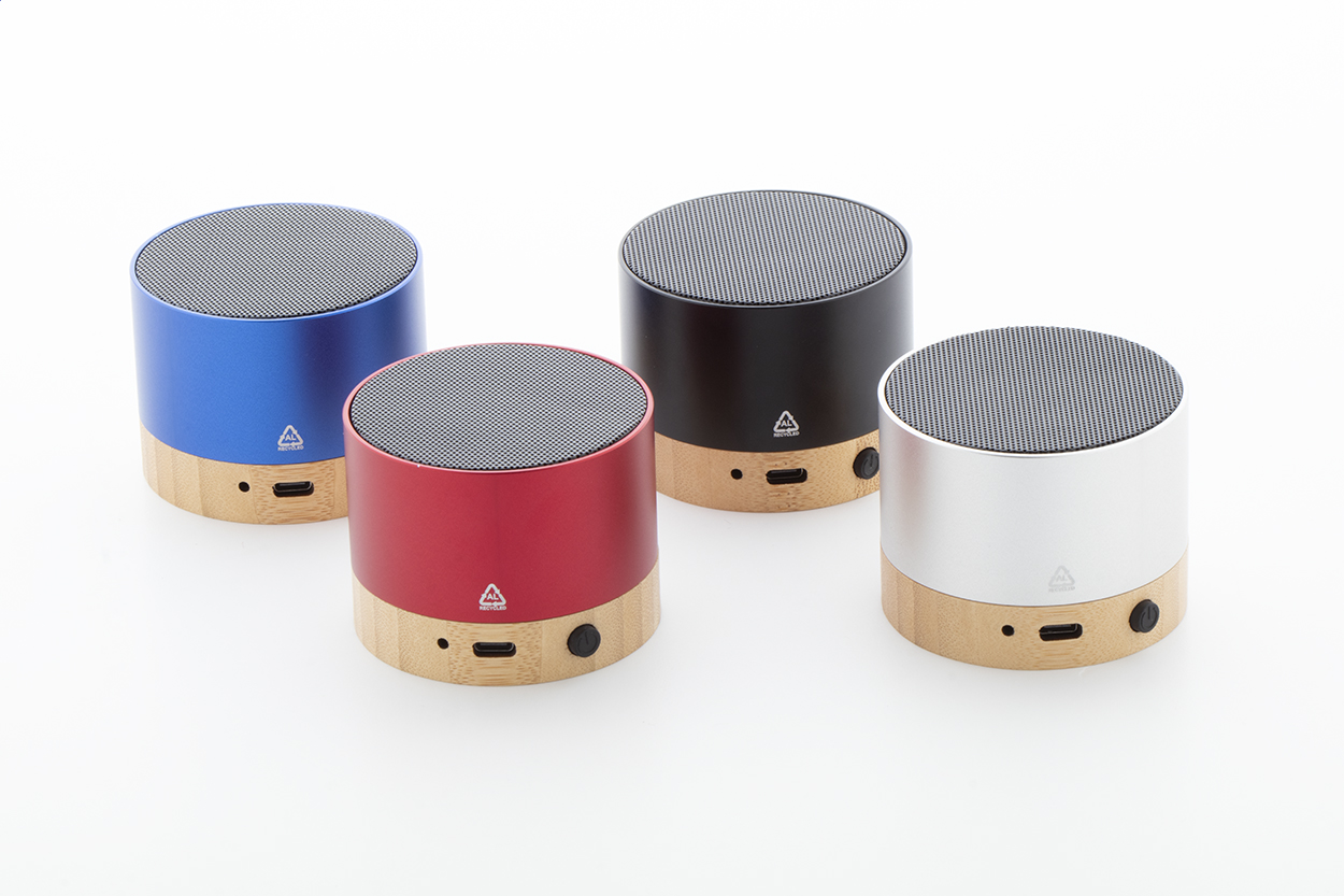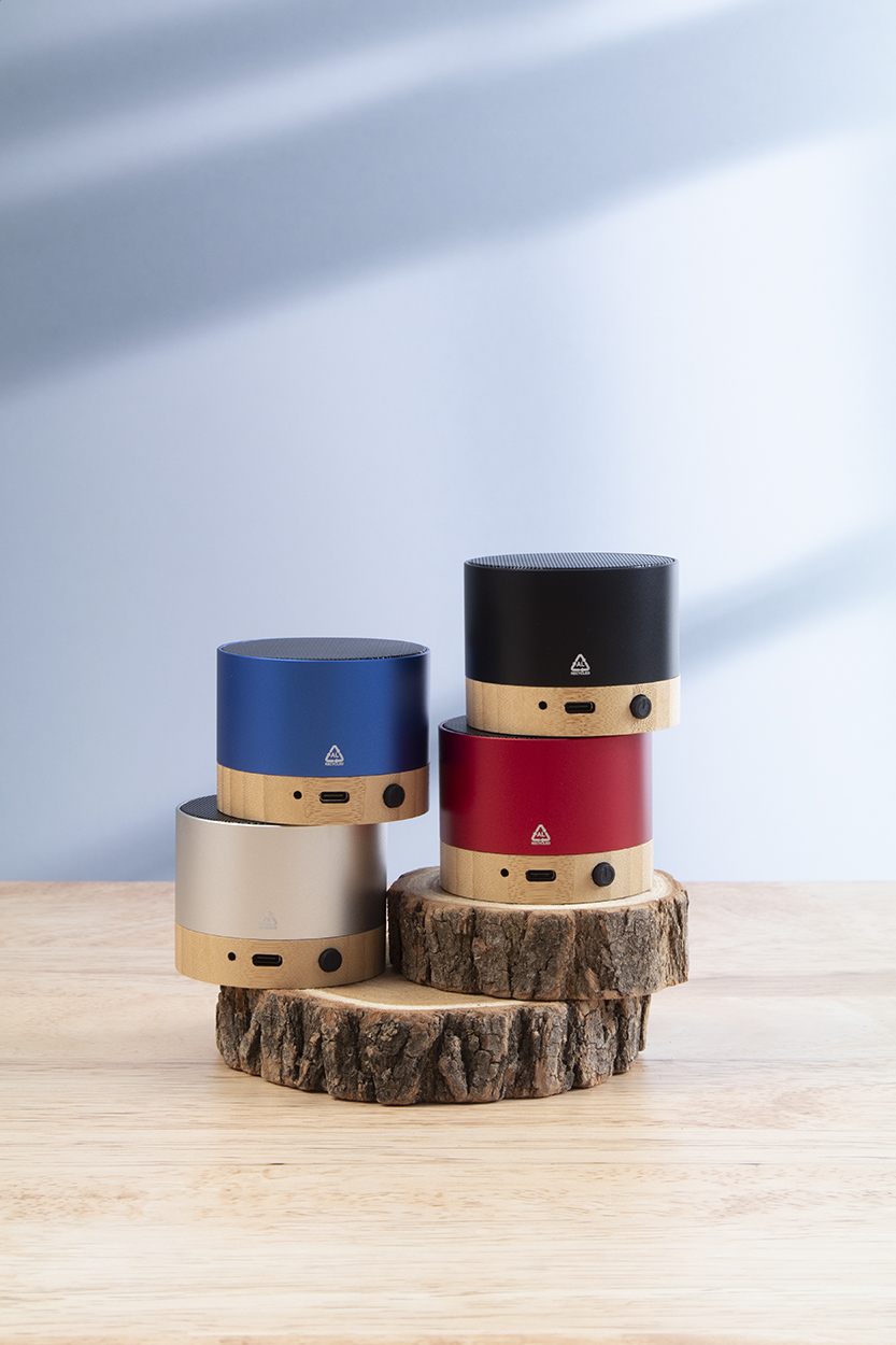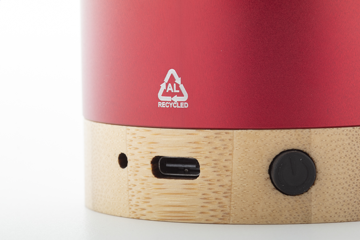 Cassa wireless in alluminio riciclato con base in bambù. Con funzione di chiamata in vivavoce e batteria ricaricabile integrata. Cavo di ricarica USB incluso.