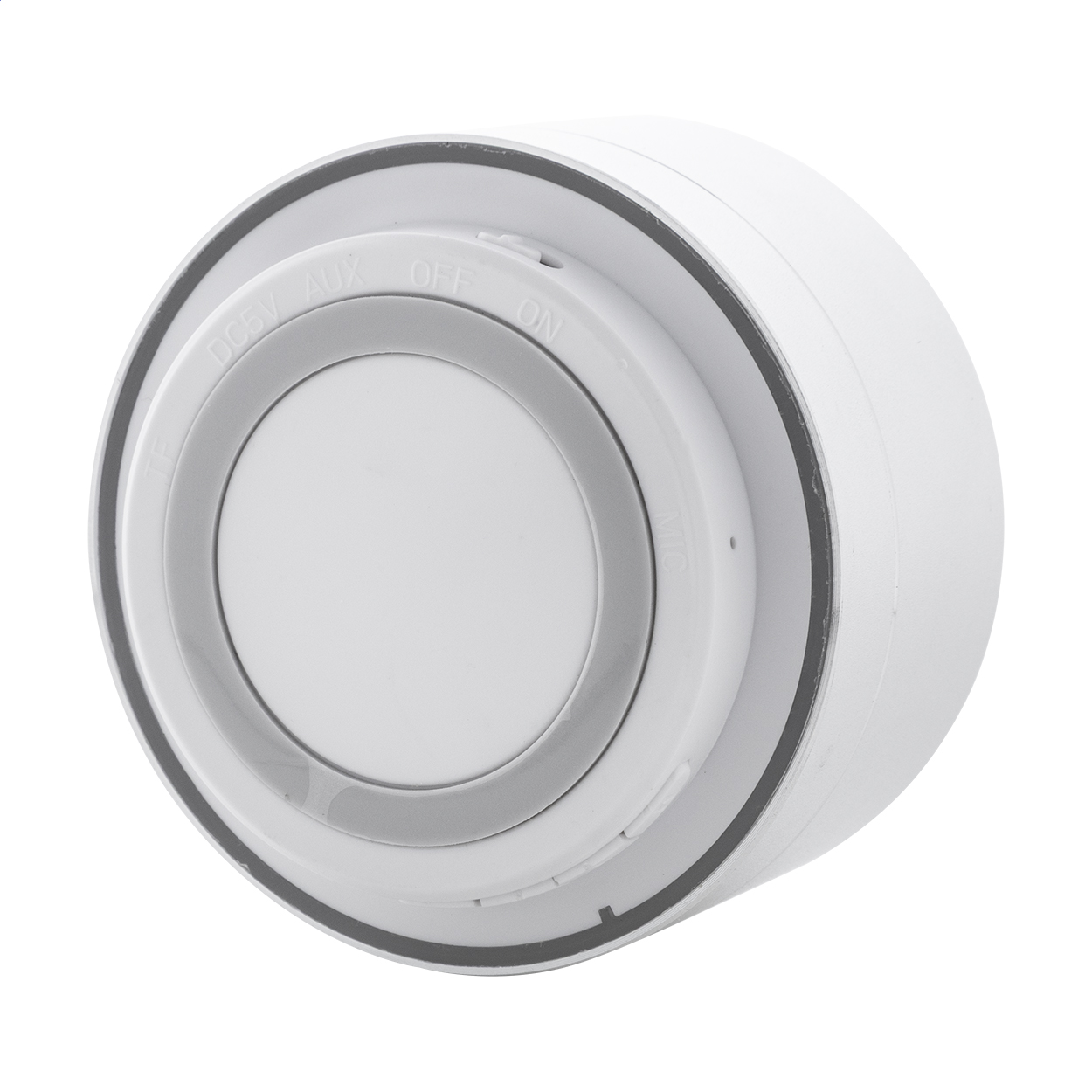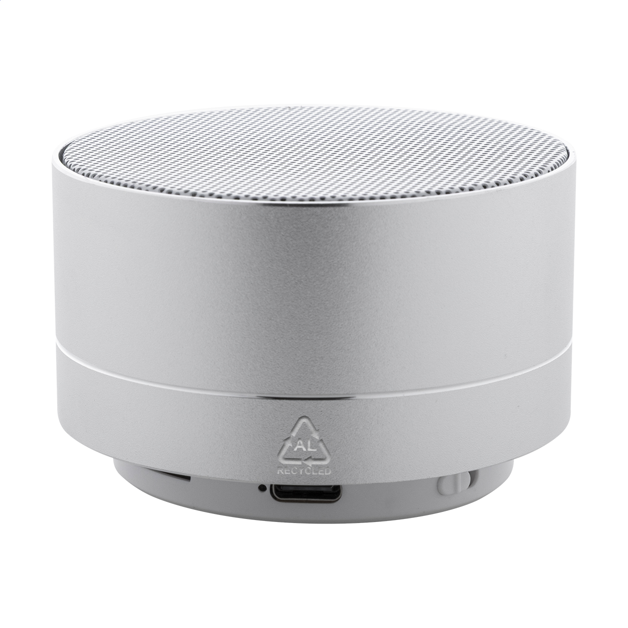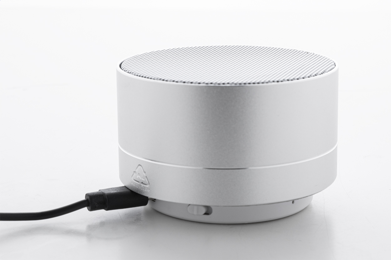 Cassa wireless in alluminio riciclato con rete metallica, luce LED sul fondo e batteria ricaricabile (300 mAh). Con funzioni di chiamata in vivavoce e riproduzione MP3 su micro SD. Cavo di ricarica USB incluso.