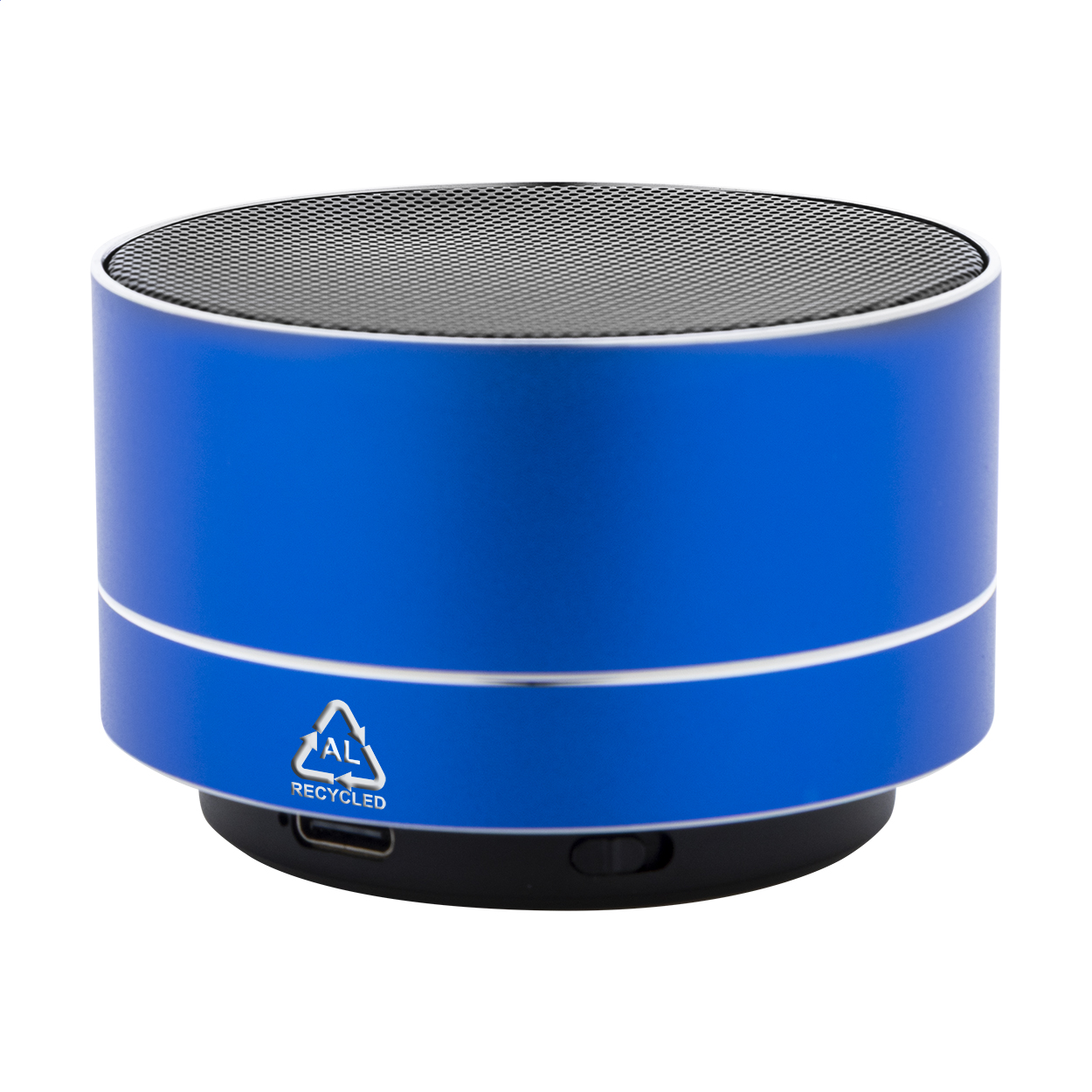Cassa wireless in alluminio riciclato con rete metallica, luce LED sul fondo e batteria ricaricabile (300 mAh). Con funzioni di chiamata in vivavoce e riproduzione MP3 su micro SD. Cavo di ricarica USB incluso.