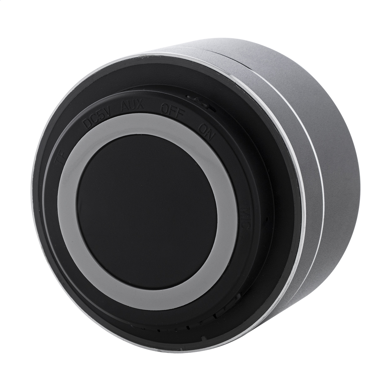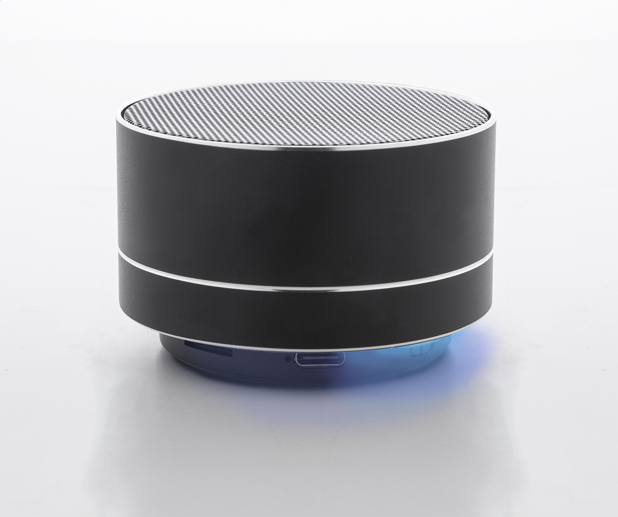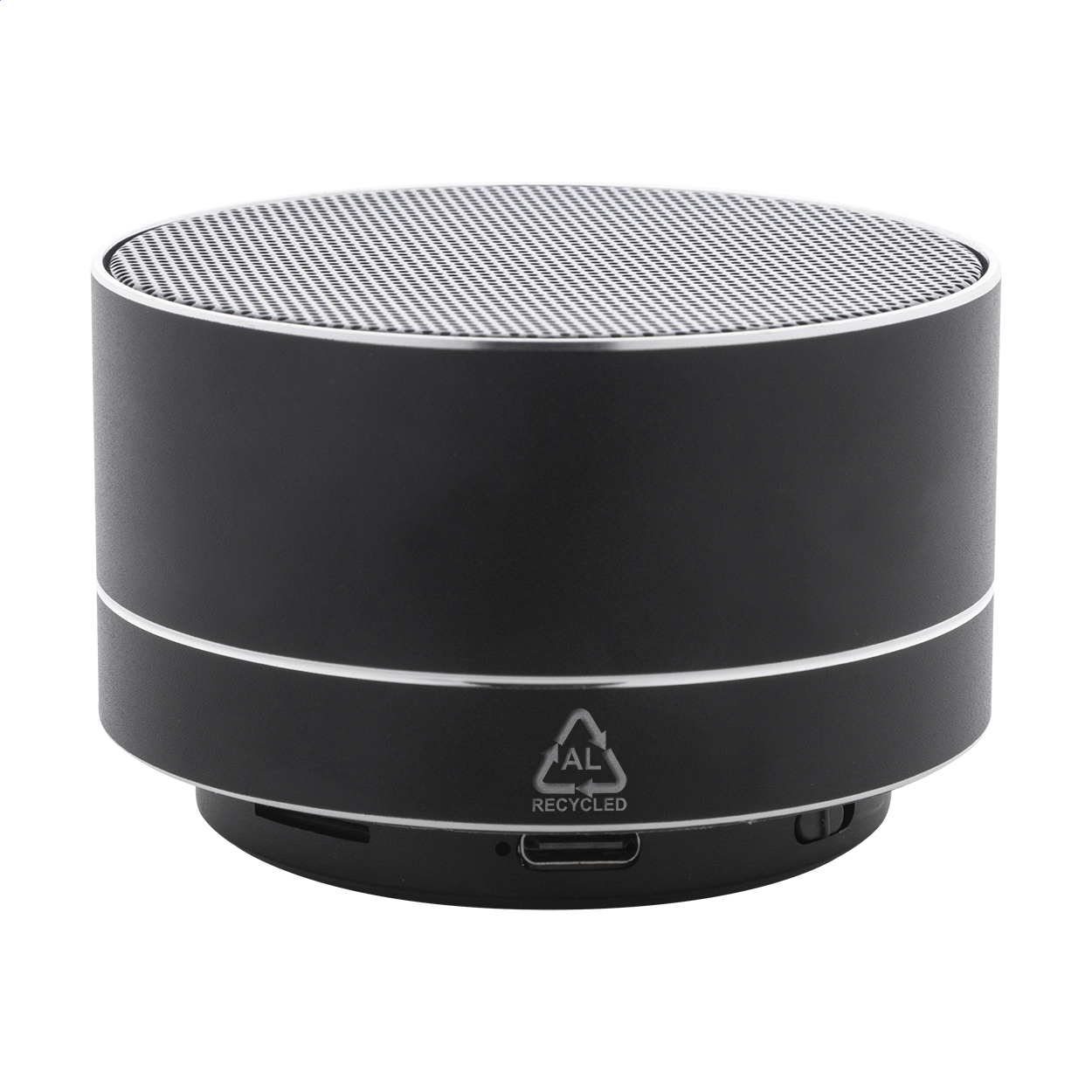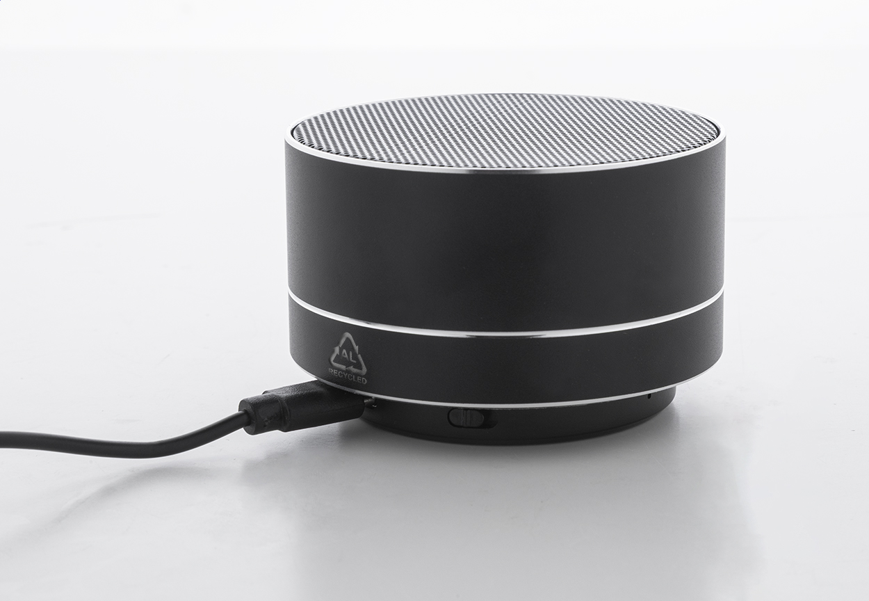 Cassa wireless in alluminio riciclato con rete metallica, luce LED sul fondo e batteria ricaricabile (300 mAh). Con funzioni di chiamata in vivavoce e riproduzione MP3 su micro SD. Cavo di ricarica USB incluso.