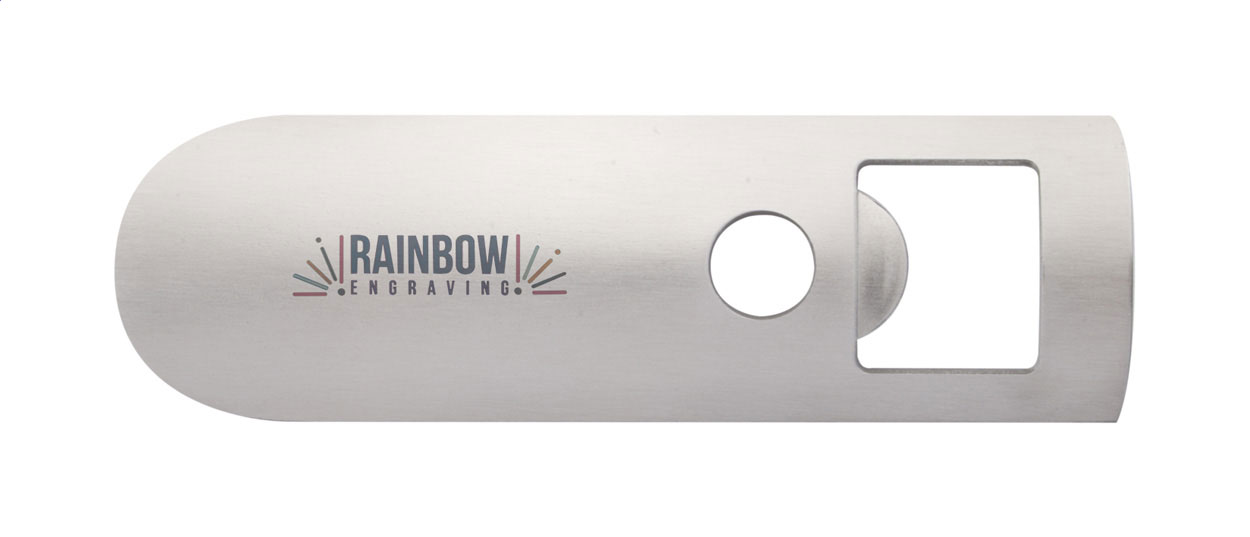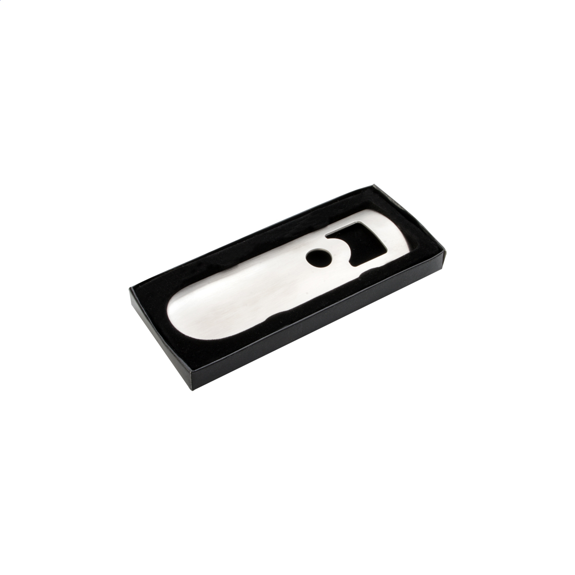 Apribottiglie in metallo confezionato in una scatolina di cartoncino nero.