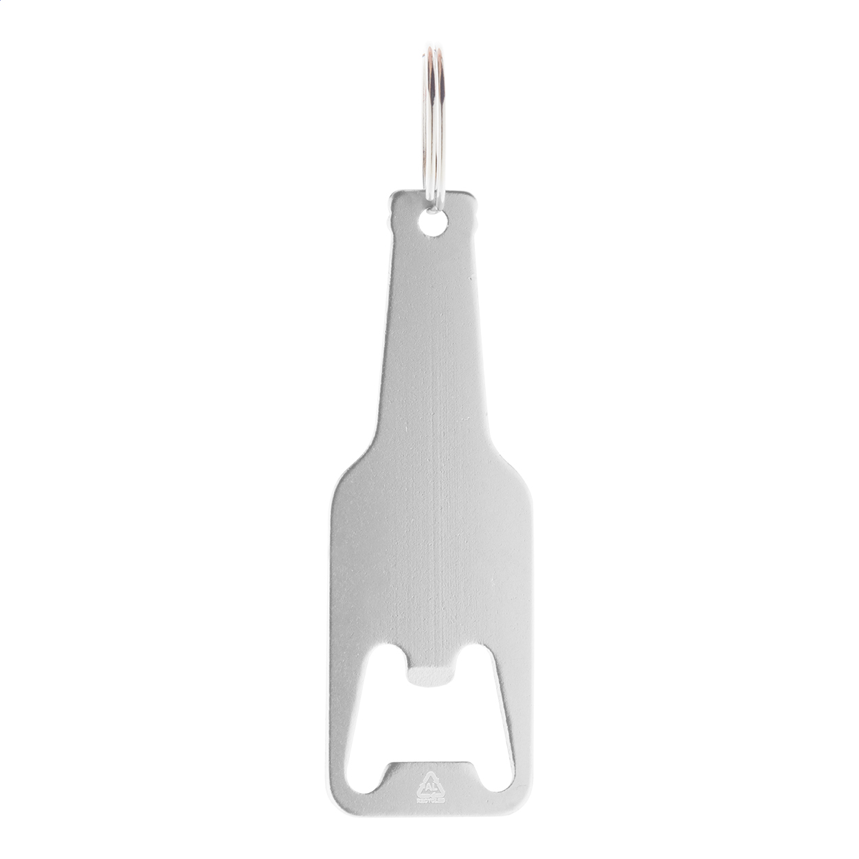 Apribottiglie in alluminio riciclato a forma di bottiglia con anello in metallo