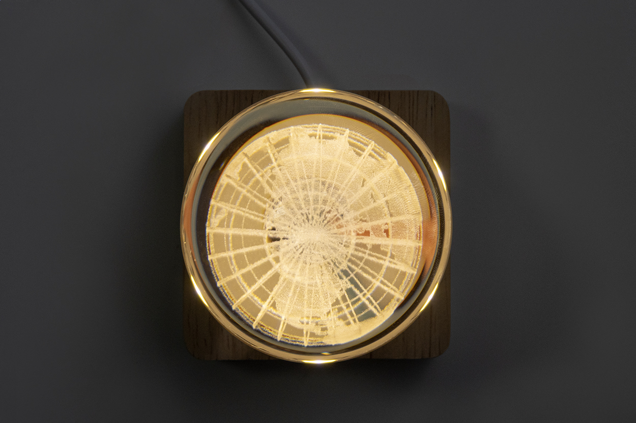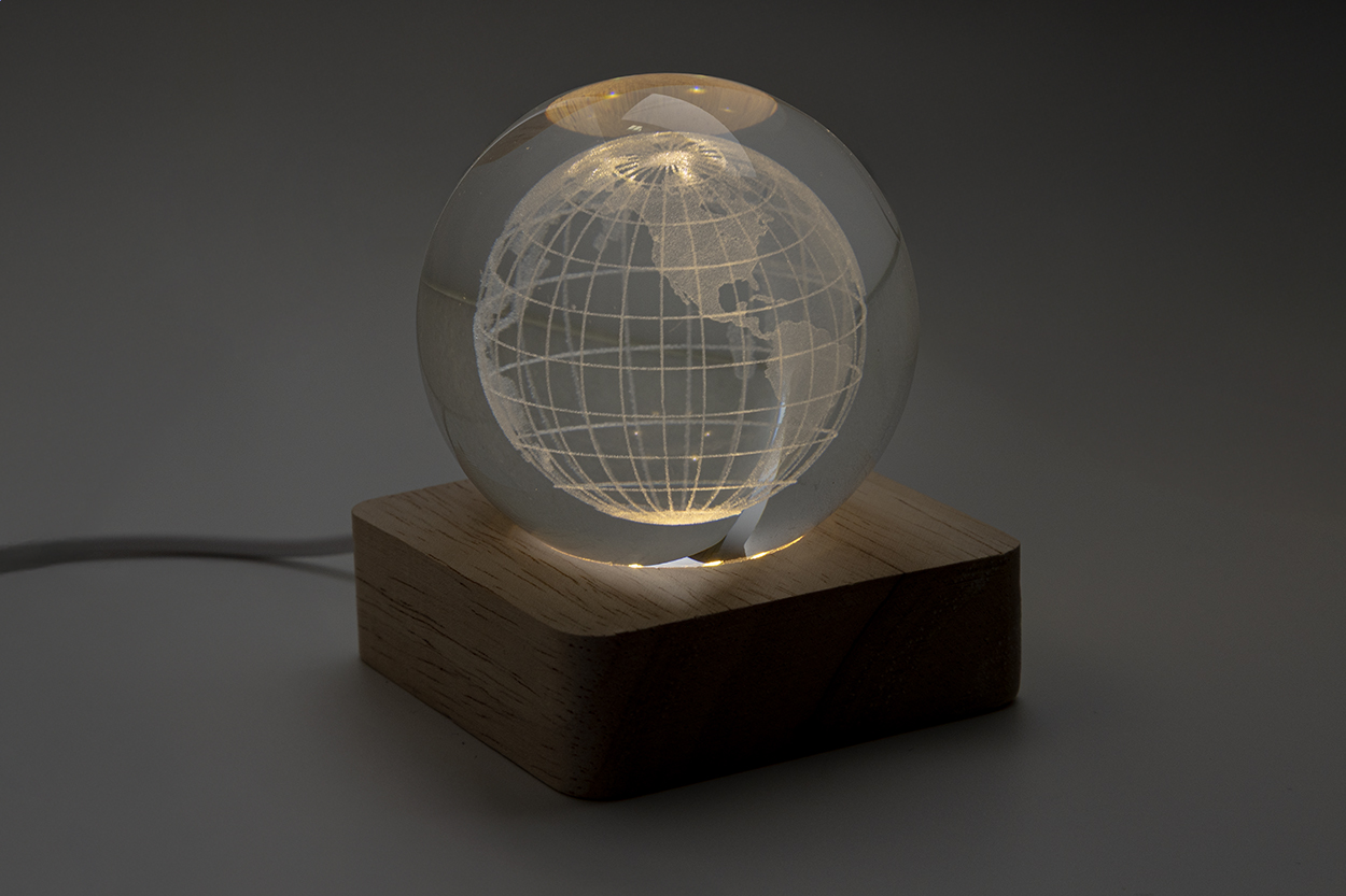 Sfera in vetro con base in legno illuminata a LED. Cavo di ricarica USB incluso.