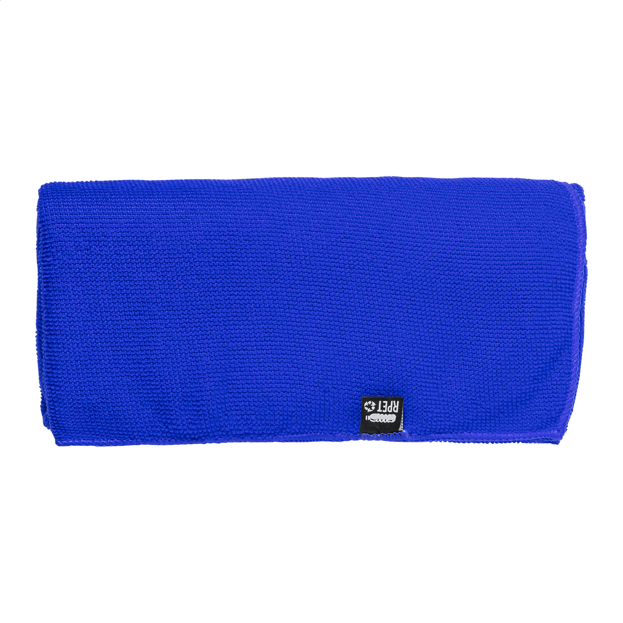 Asciugamano in microfibra di poliestere RPET da 160 g/m² con etichetta distintiva RPET.