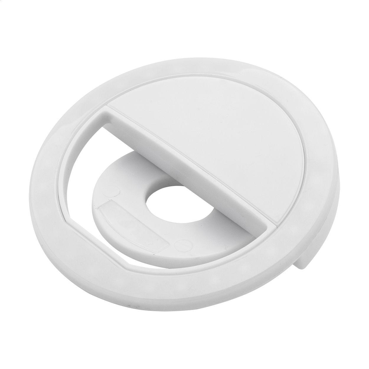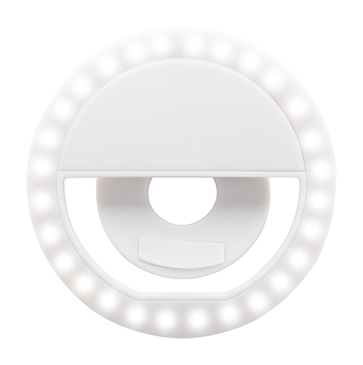 Luce anulare per selfie in ABS riciclato con 28 LED da utilizzare con i telefoni cellulari. Dispone di 3 livelli di luminosità regolabili e di una batteria ricaricabile integrata (150 mAh). Completa di cavo di ricarica USB.