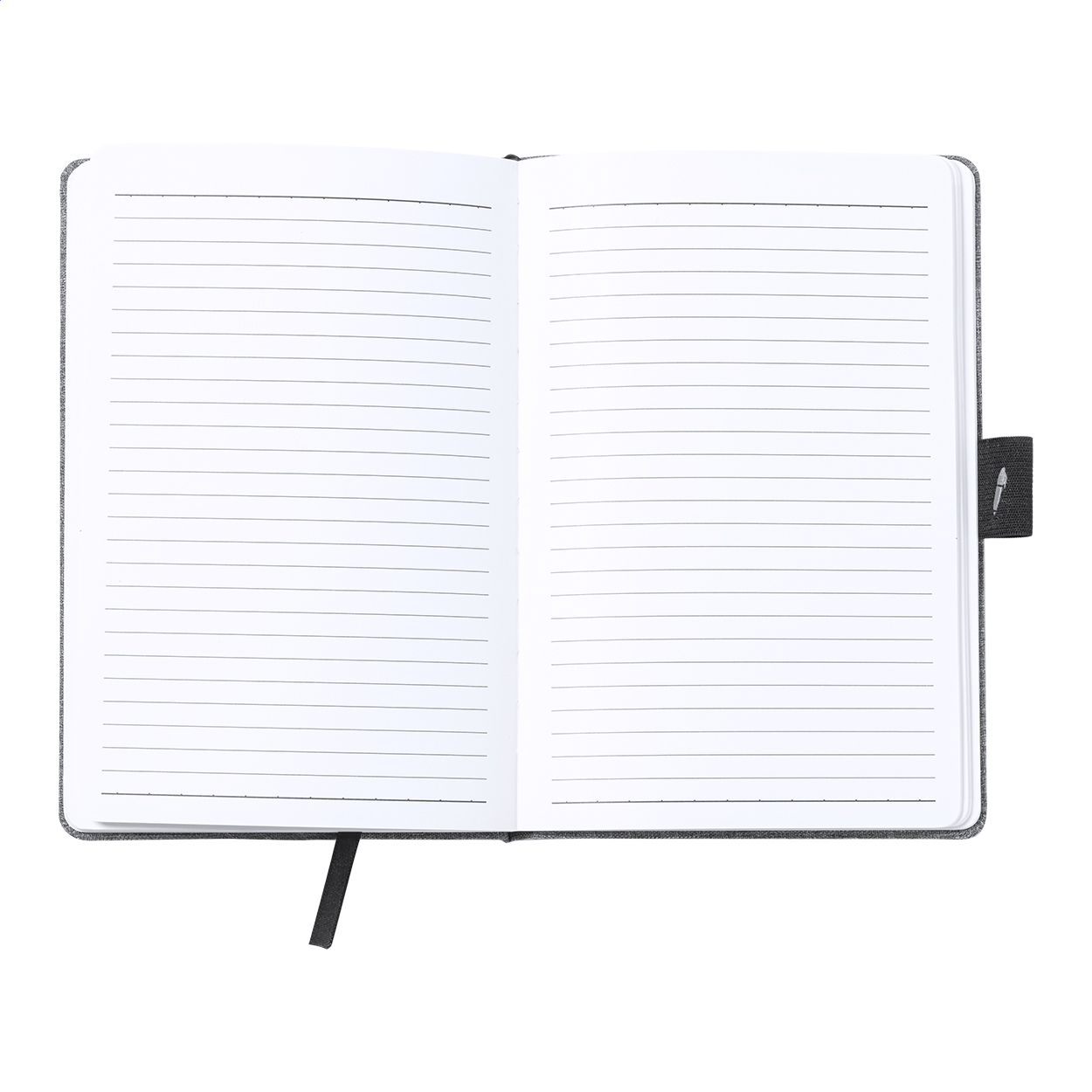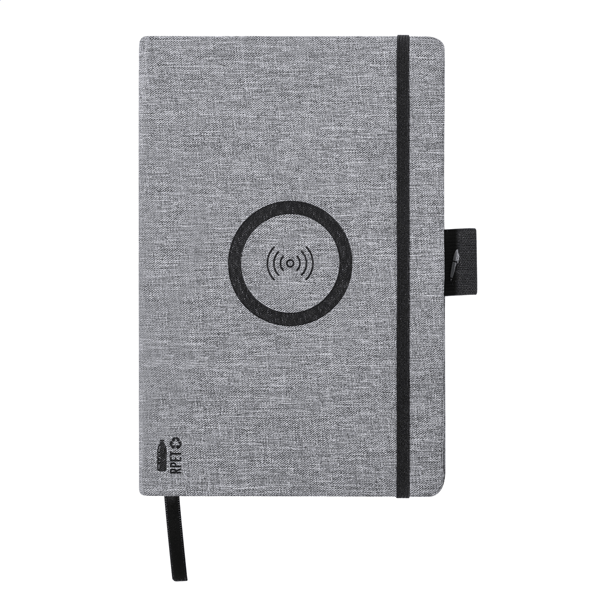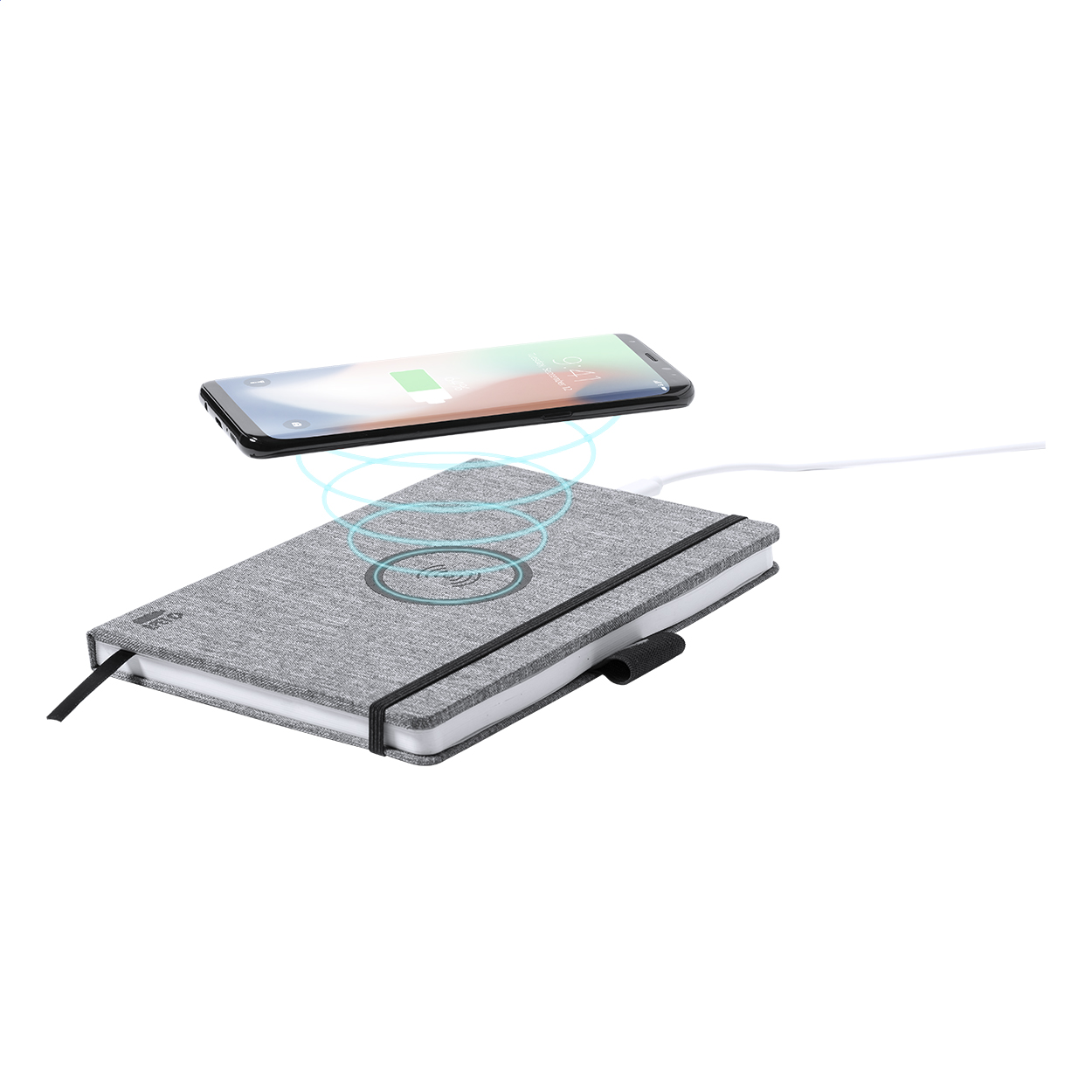 Quaderno con copertina in poliestere RPET, caricatore veloce wireless incorporato (10W) e 80 fogli a righe. Formato A5. Incluso cavo di ricarica USB. Poliestere 300D RPET.