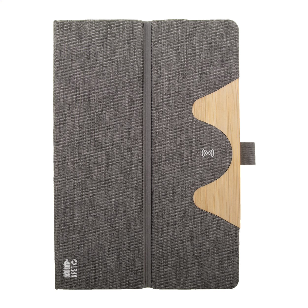 Quaderno formato A5, con 80 pagine a righe in carta riciclata, copertina in poliestere RPET ed inserto in bambù, portacellulare, caricatore rapido wireless integrato (15W) e cavo di ricarica USB.