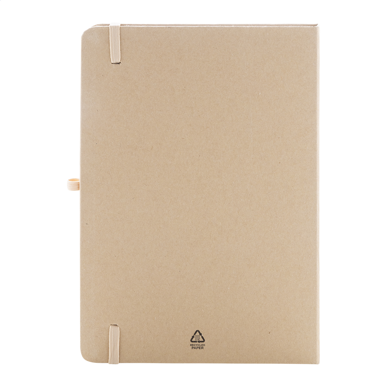 Quaderno formato A5 con copertina in cartoncino riciclato, 70 fogli in carta riciclata, elastico e portapenne. La copertina interna integra 25 foglietti adesivi, 125 segnapagina e una tasca portacarte.
