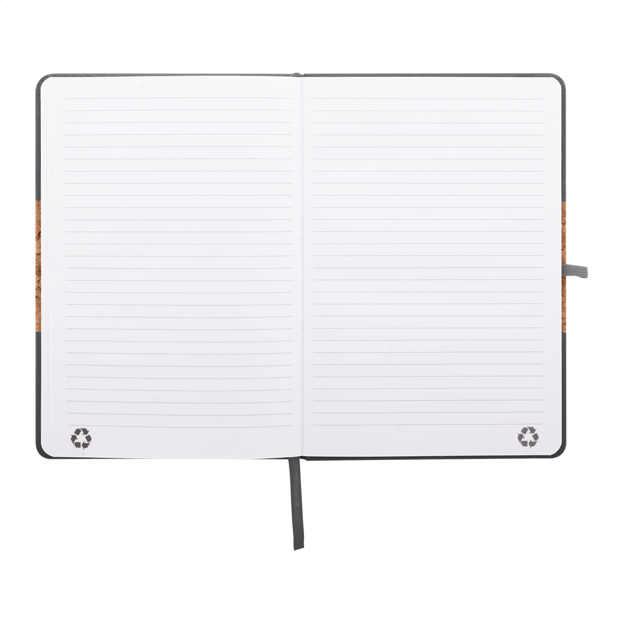 Quaderno formato A5 con copertina in sughero naturale e pelle PU riciclata, 80 fogli a righe in carta riciclata, segnalibro in colore coordinato, elastico e portapenne.